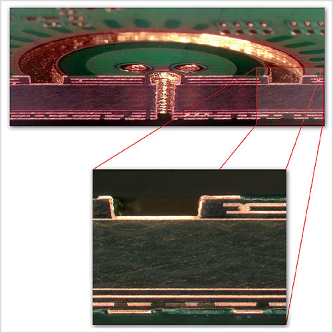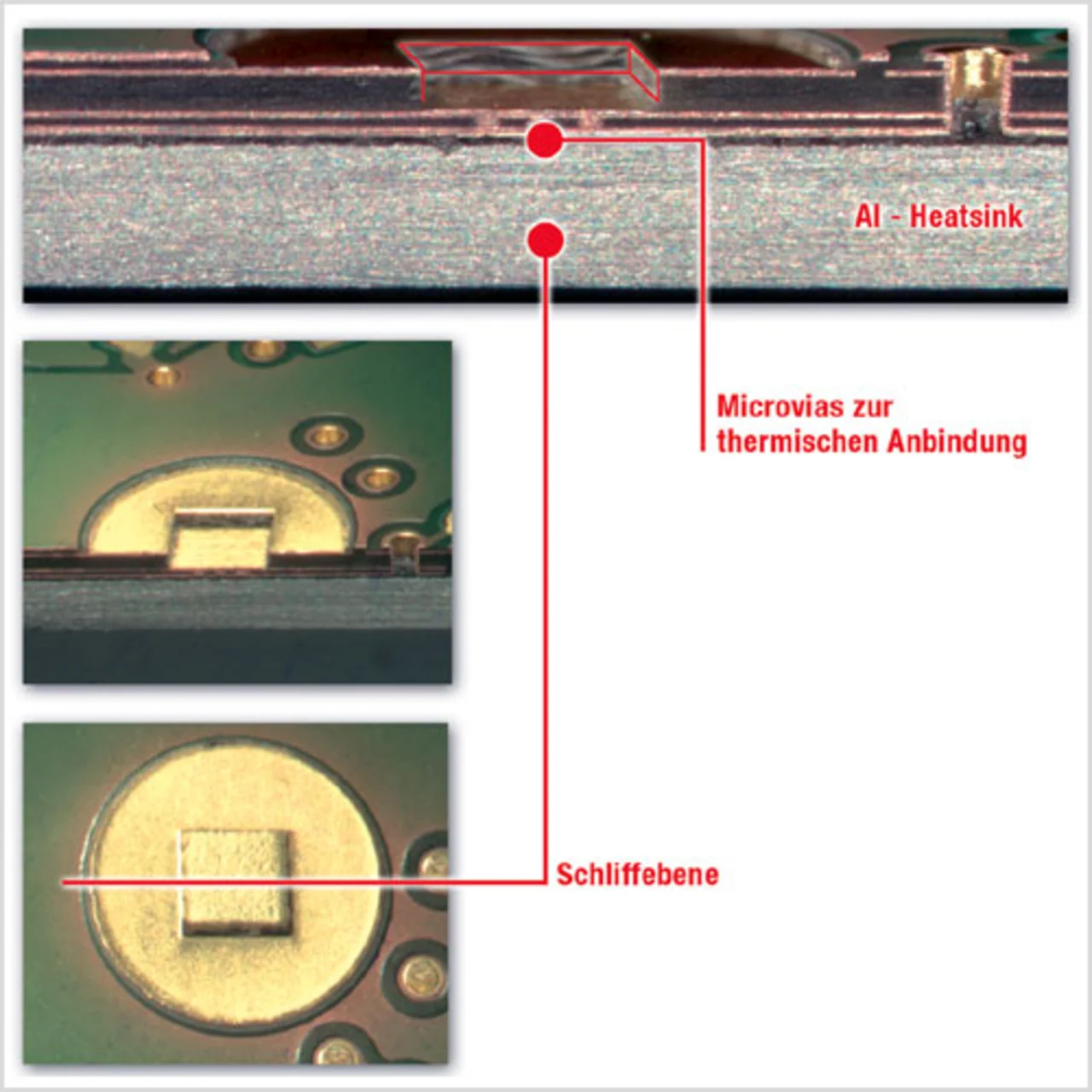 Ein ähnlicher Anwendungsfall mit gegenteiligen Anforderungen soll demonstrieren, wie vielseitig das neue Bearbeitungsverfahren ist (Bild 6). Hier handelt es sich um elektrisch getrennte Ebenen (Potenziale) in einer zweistufigen Lasercavity, bei welcher der Serienstart kurz bevor steht. Im Gegensatz zur Sick-Anwendung, bei der es um die Metallisierung der Cavity-Seitenwände geht, ist hier das Gegenteil gefordert: In die viereckige, innere Lasercavity wird eine Hochleistungsdiode eingesetzt, daher muss die Bodenfläche thermisch an einen passiven Kühlkörper angeschlossen sein. Dies geschieht über Microvias, die von der Unterseite her gebohrt und metallisiert werden. Über eine Wärmetransferfolie wird der Aluminiumkühlkörper gegen die Leiterplatte laminiert. Die mittlere, runde Ebene dient zur elektrischen Ankontaktierung des Bauelements.
