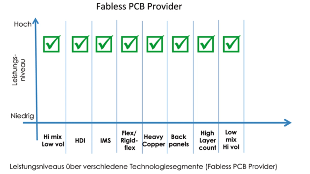 Die kombinierten Beschaffungsvorteile werden freigesetzt, wenn von einem Fabless PCB Provider eingekauft wird. Was sind die Merkmale eines globalen Fabless PCB Providers? Ein zuverlässiger Fabless PCB Provider besitzt alles, um Leiterplatten herzustellen, jedoch nicht die Produktionsanlagen selbst. Die werden ersetzt durch ein Portfolio von komplementären Produktionspartnern, welches der Provider über die Jahre entwickelt und optimiert. Das Portfolio wird immer auf dem neusten Stand gehalten, um aktuellen Marktanforderungen gerecht zu werden. Idealerweise haben die Produktionspartner wenig oder keine Überlappung in ihren Kernkompetenzen und weisen beste Leistungen in den individuellen Disziplinen auf.