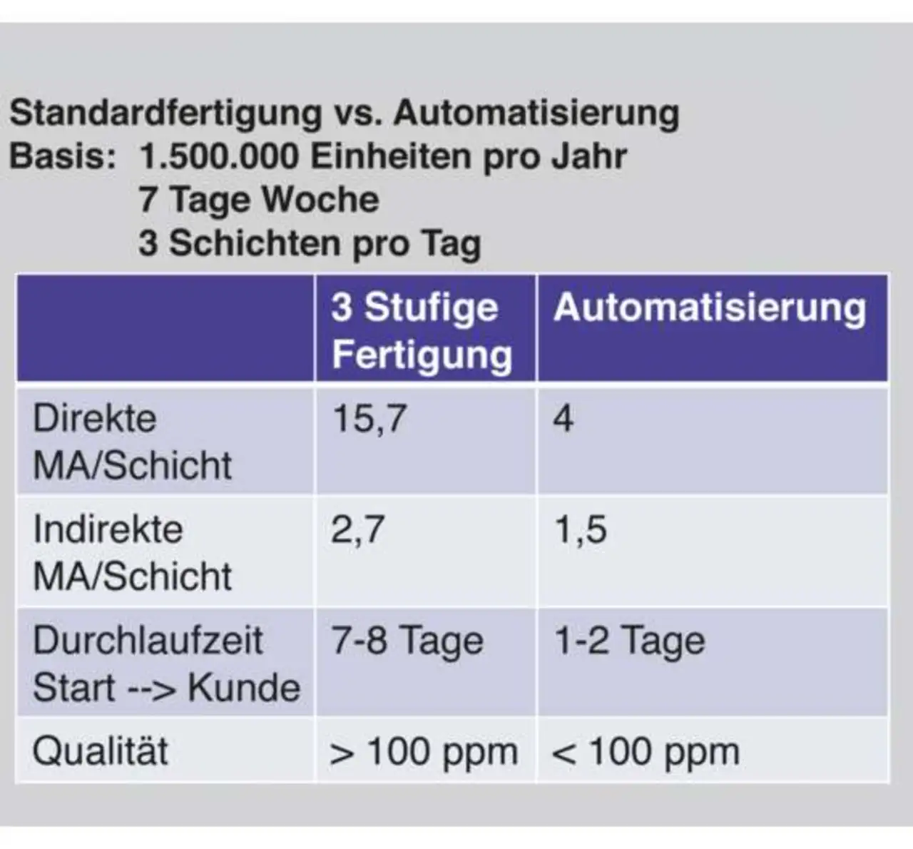 Lohnt sich dieser Aufwand denn überhaupt, oder wäre die Fertigung woanders nicht billiger? Das verneint Hess in seinem Vortrag klar. Schließlich, so Hess, gebe es schlagkräftige Vorteile durch die Fertigung in Deutschland, wie er anhand einer Gegenüberstellung »Standardfertigung vs. Automatisierung« aufzeigt (siehe Tabelle). Die Basis für diese Erhebung sind 1,5 Mio Einheiten / Jahr. Gefertigt wird an sieben Tagen pro Woche im Dreischichtbetrieb.