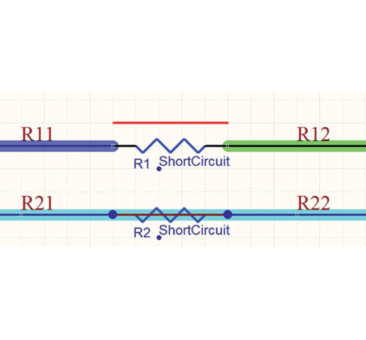 Der umgekehrte Fall tritt ein, wenn in den verwendeten Zuleitungen ein Widerstand entflochten worden ist. In diesem Fall hat man vor und nach dem Widerstand je ein Netz, was einen Längenabgleich deutlich erschwert. Abhilfe liefert ein kleiner Trick: Man überbrückt einfach kurzfristig im Schaltplan den verwendeten Widerstand, so wie in Bild 3 gezeigt.
