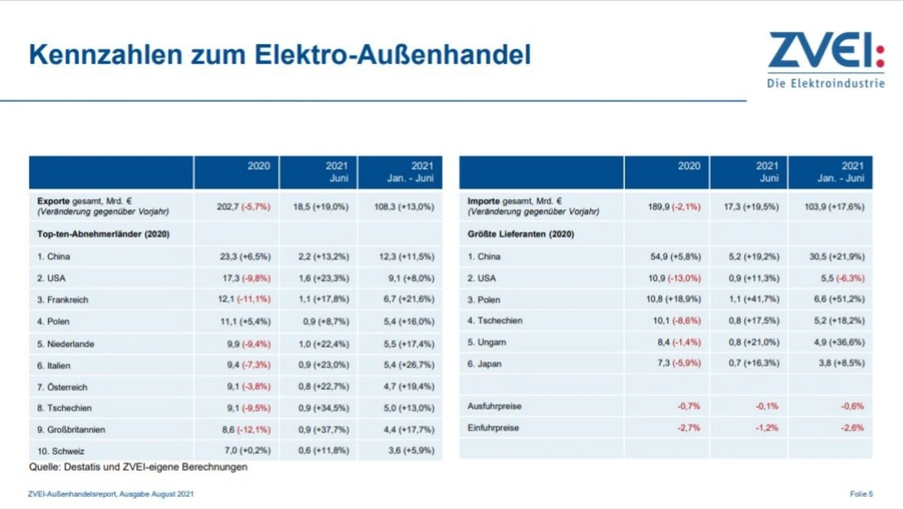 Die Ausfuhren im Wert von 108,3 Milliarden Euro übertrafen den Vorjahreszeitraum um 13 Prozent und lagen auch 1,8 Prozent über dem Wert aus dem Vorkrisenjahr 2019, wie der Branchenverband ZVEI am Donnerstag in Frankfurt berichtete. Die Importe elektrotechnischer und elektronischer Erzeugnisse nach Deutschland konnten im Juni um 19,5% gegenüber Vorjahr auf 17,3 Mrd. € zulegen. Kumuliert von Januar bis Juni 2021 stiegen die Einfuhren um 17,6% auf 103,9 Mrd. €.