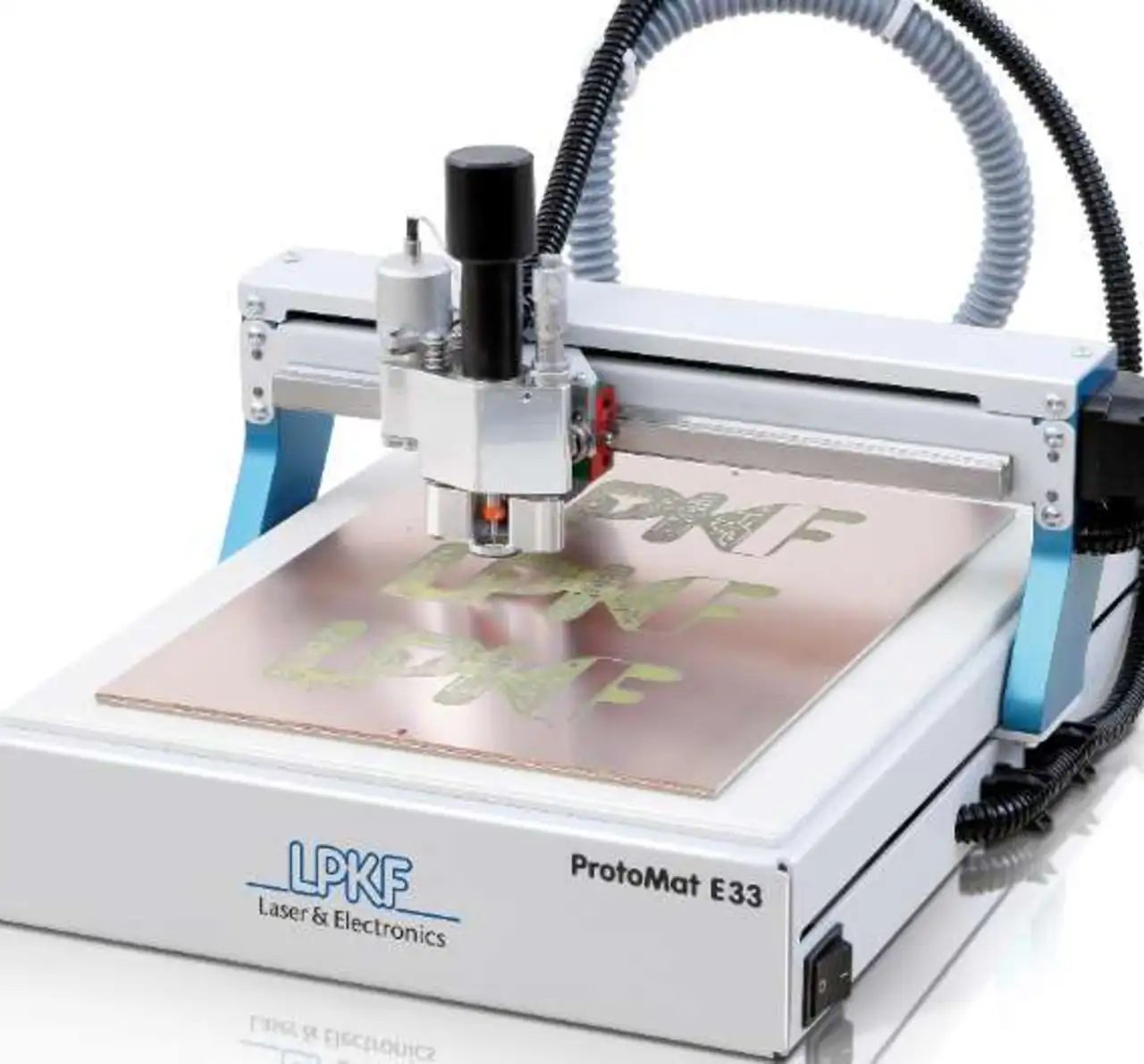 Zusätzlich zu den neuen S-ProtoMaten hat LPKF ein kostengünstiges Einstiegsgerät vorgestellt: Der ProtoMat E33 verfügt über eine 30.000 U/min-Spindel und braucht nur wenig mehr Platz als ein DIN-A3-Blatt. Das System kann Leiterplatten strukturieren, bohren und fräsen. Es komme zwar an die Bearbeitungsgeschwindigkeit der S-Serie nicht ganz heran, biete aber nach Aussage von LPKF trotzdem eine sehr gute Präzision. Für den LPKF ProtoMat E33 sind keine Upgradeoptionen vorgesehen.