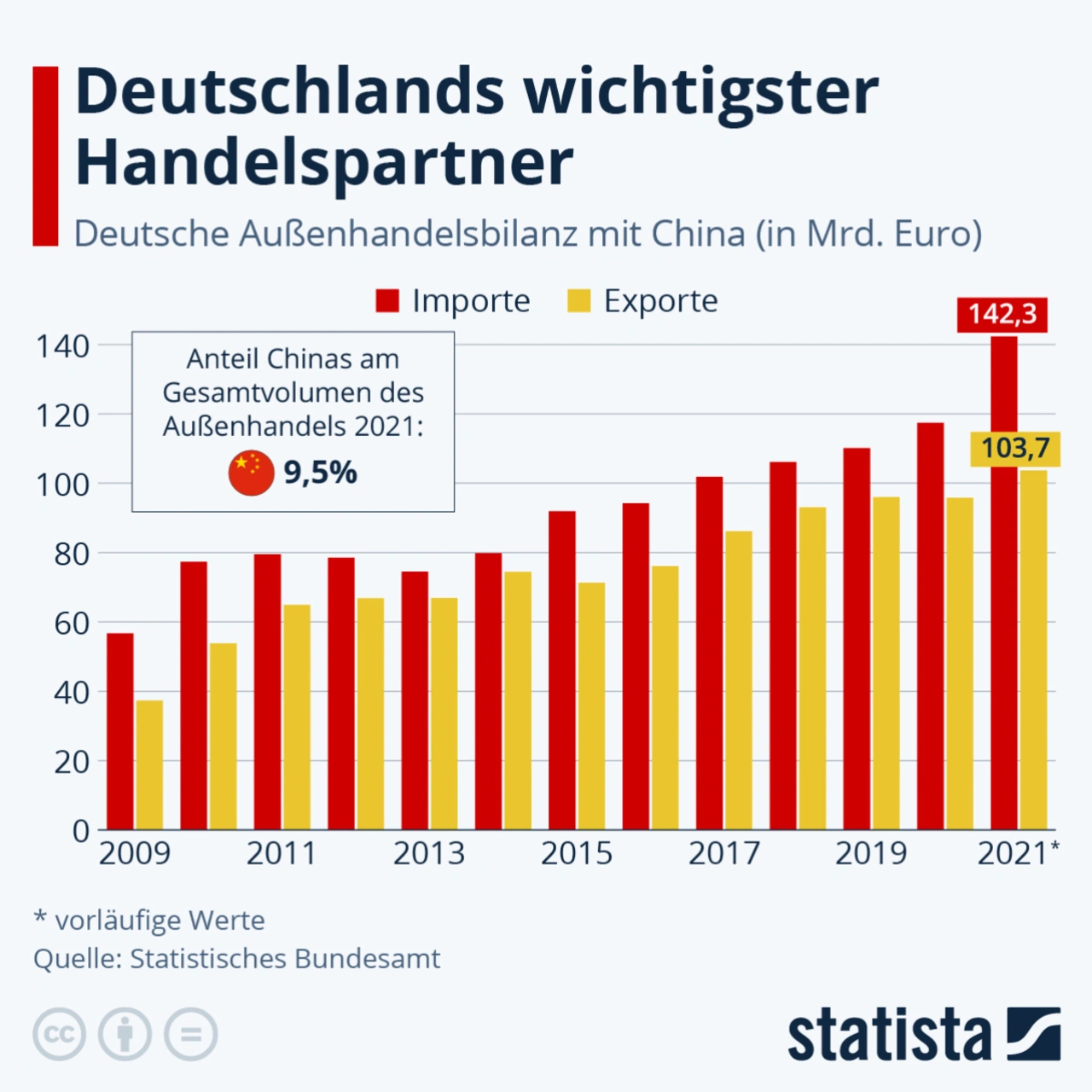 Laut vorläufigen Daten des Statistischen Bundesamtes hatten Importe aus China im vergangenen Jahr einen Rekordwert von rund 142,3 Milliarden Euro. Dabei importiert Deutschland vor allem Datenverarbeitungs- und Nachrichtentechnik. Ins Reich der Mitte wurden von Deutschland aus rund 103,7 Milliarden Euro Warenwert exportiert - Über 25 Milliarden Euro entfallen dabei auf Kraftfahrzeuge sowie entsprechende Teile und Zubehör. China hält momentan nach Angaben von Statista einen Anteil von rund 9,5 Prozent am Gesamtvolumen des deutschen Außenhandels - vor zehn Jahren lag dieser noch bei 7,4 Prozent.