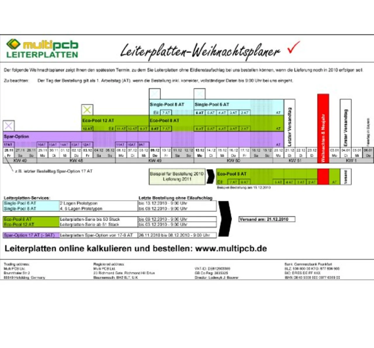 Multi PCB bietet auf seiner Webseite einen besonderen Terminplaner an, der anzeigt, bis wann man Leiterplatten vor Weihnachten ohne Eildienst und dem damit verbundenen Aufpreis bestellen kann.