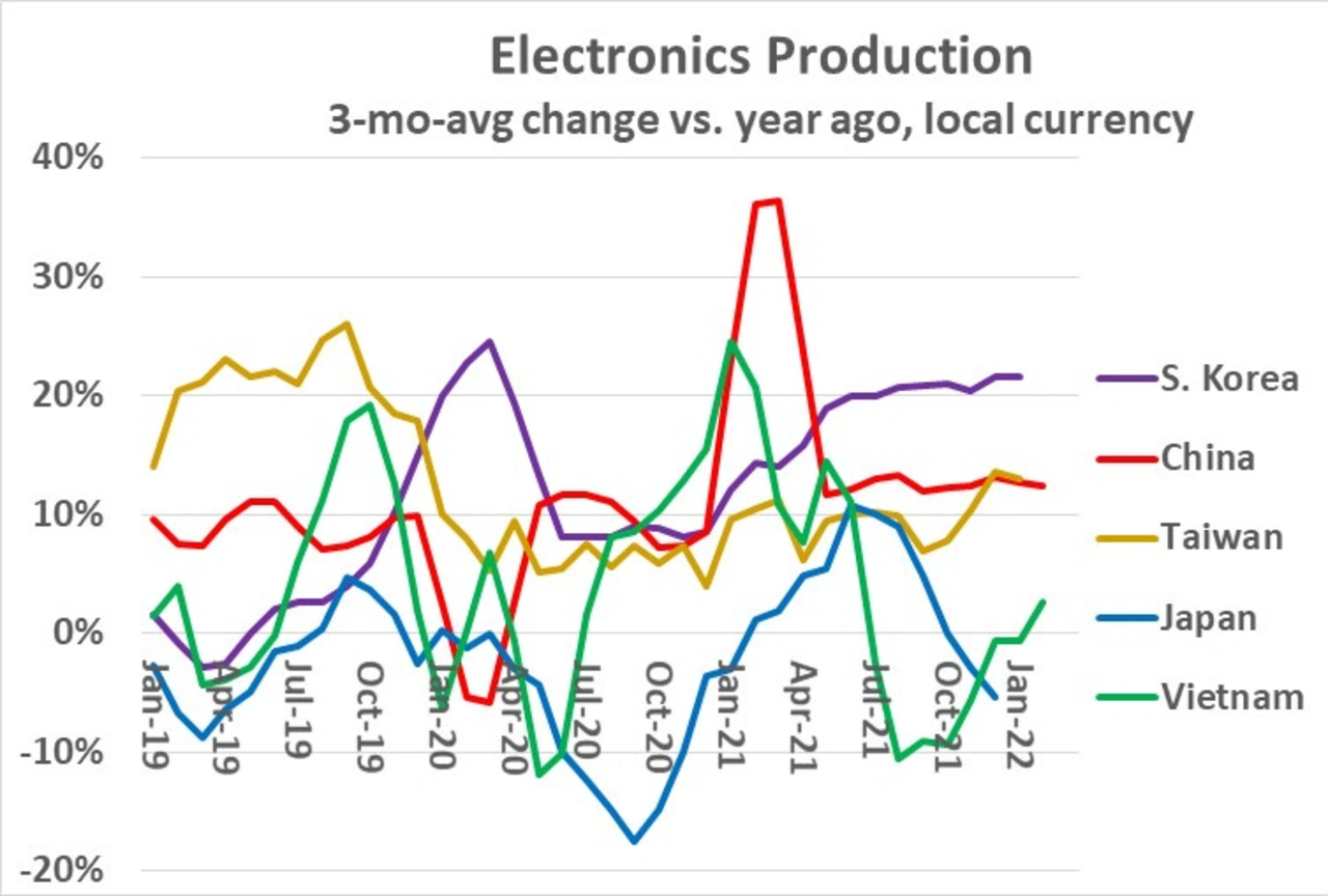 Aufgrund pandemiebedingter Stilllegungen ging die Elektronikfertigung in Vietnam im Herbst 2021 zurück, kehrte aber im Februar 2022 auf einen Wachstumspfad zurück.