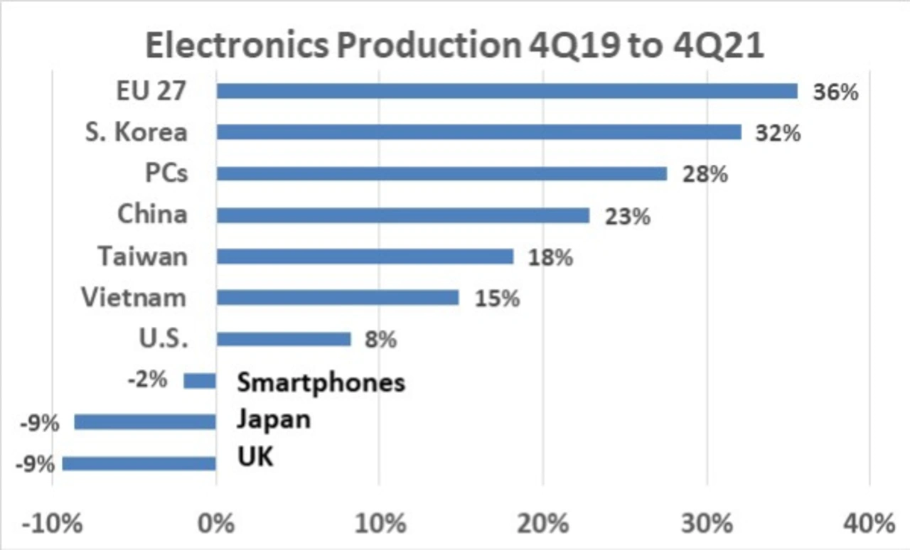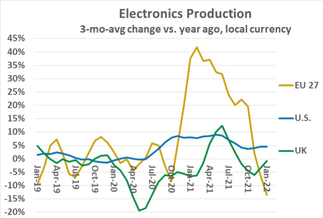 Die 27 Länder der Europäischen Union (EU 27) verzeichneten im Januar 2022 einen Rückgang von 14 Prozent, nachdem sie in der ersten Hälfte des Jahres 2021 ein robustes Wachstum von 30 bis 40 Prozent verzeichnet hatten. Zusätzlich zu den Pandemieeffekten hat die EU 27 von einer Verlagerung der Produktion aus dem Vereinigten Königreich nach dem Brexit profitiert. Mit Ausnahme der Erholung durch die Pandemie von April bis August 2021 verzeichnete das Vereinigte Königreich in den letzten drei Jahren eine stagnierende bis rückläufige Elektronikproduktion.