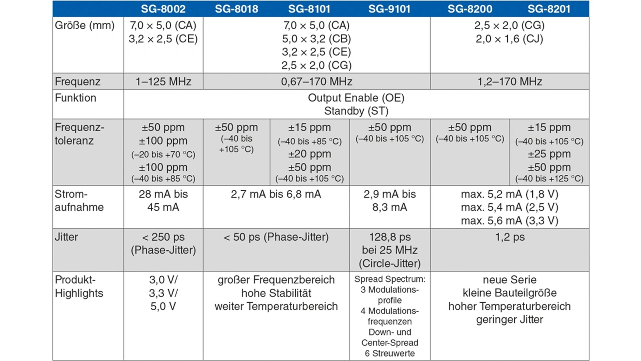 Mit den brandneuen Serien SG-8200 und SG-8201 (auch als Automotive-Version verfügbar) geht Epson den Weg der Miniaturisierung weiter und setzt mit dem neuen Package 2,0 mm × 1,6 mm auf dem Quarz-Oszillatormarkt neue Trends. Auch der Phasenjitter sowie der Stromverbrauch wurden nochmals optimiert.