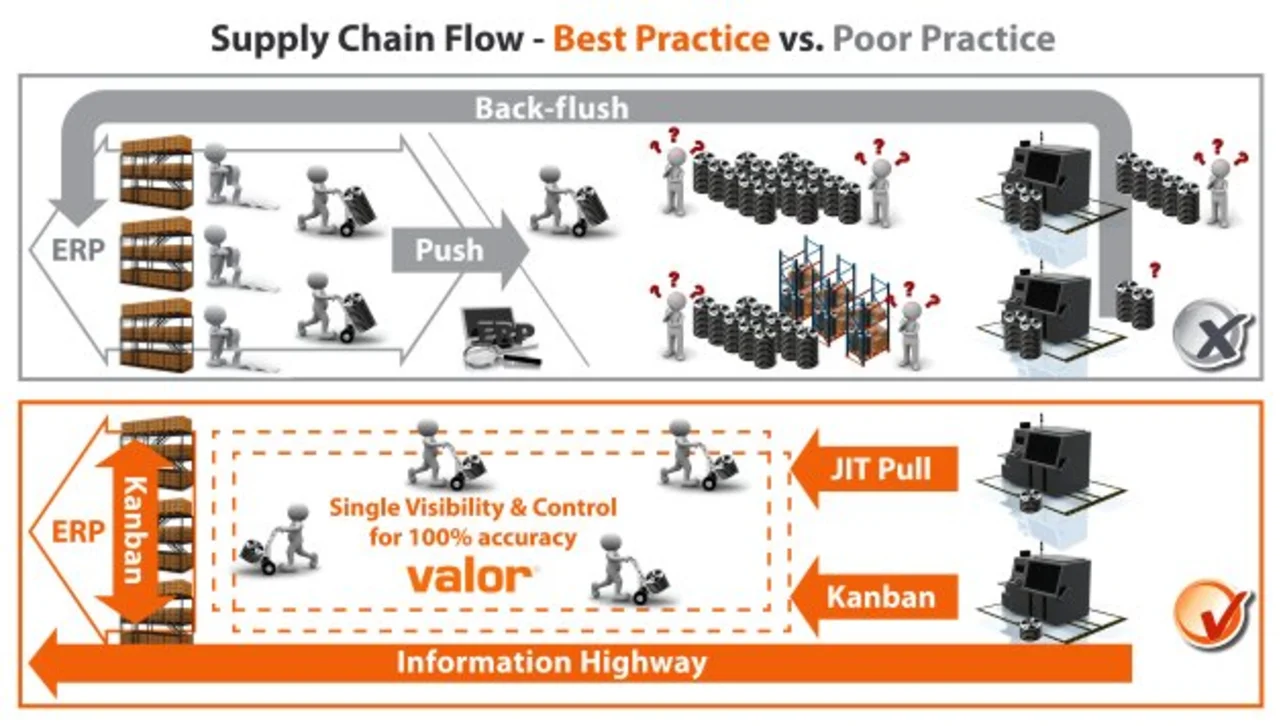 Nun stellte das IT-Team seine Ergebnisse (Bild) vor. Es berichtete, dass in Linie B der ERP- und MRP-Betrieb über das Jahr stabil und weniger komplex zu managen war, sehr wenige manuelle Änderungen erforderte und auch keine großen Probleme auftraten. Das Valor-Warehouse-Management-Tool hat den Materialbestand des ERP kontinuierlich an den physikalischen Materialien ausgerichtet. Das vom Valor-Information-Highway gegebene Live-Feedback über Materialverbauch und Ausschuss gewährleistete, dass das ERP-System zu jedem Zeitpunkt genau wusste, welche Materialien verbraucht und wie viele Produkte gefertigt wurden. In Linie A verlief der MRP-Betrieb jedoch ziemlich verrückt, da aufgrund falscher Daten viele Probleme auftraten. Ein Lagerbestand von über einer Millionen Euro musste abgeschrieben werden, weil wegen des unkorrekten Lagerbestands, der sich aus unbekanntem Ausschuss und Materialmissmanagement ergab, Überbestellungen erfolgten.
