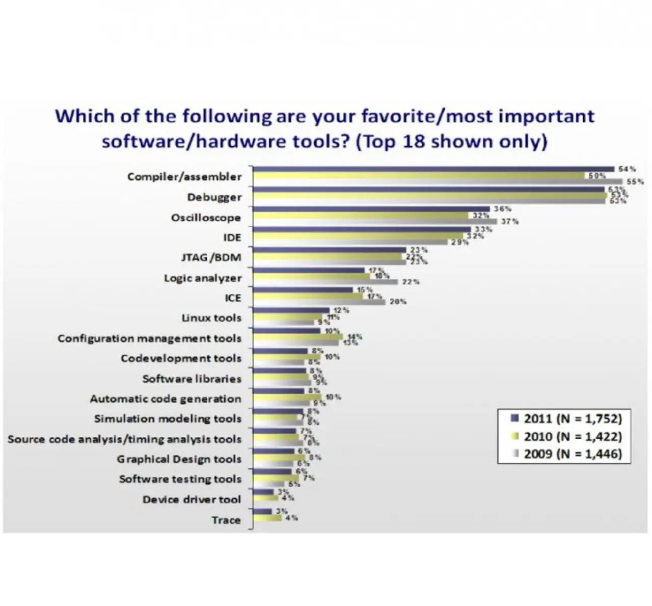 Nachdem im Jahr 2009 und 2010 weniger als 1500 Entwickler an der Umfrage teilgenommen hatten, stieg die Zahl 2011 auf 1752 Teilnehmer. Mit 54 % wurde in diesem Jahr der Compiler bzw. Assember als wichtigstes Tool bewertet, gefolgt von dem Debugger mit 53 % und dem Oszilloskop mit 36 %. Damit konnte sich der Compiler den Spitzenplatz vom Debugger zurückerobern, den dieser 2010 mit ebenfalls 53 % vor dem Compiler mit 50 % eingenommen hatte.