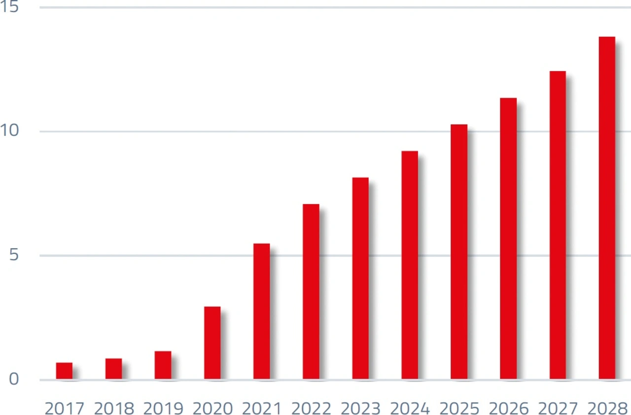 Statistisch findet alle elf Sekunden auf der Welt ein Ransomware-Angriff statt, so die Europäische Kommission. Allein diese Ransomware-Angriffe sollen im Jahr 2021 weltweit geschätzte Kosten von 20 Mrd. Euro verursacht haben. Statista-Zahlen sagen ein globales Cybercrime-Schadensvolumen von etwa 10 Billionen Dollar für 2025 vorher (Bild 1). Gleichzeitig sollen Cyberkriminelle rund 10 Mio. DDoS-Angriffe (Distributed Denial of Service) gestartet haben.
