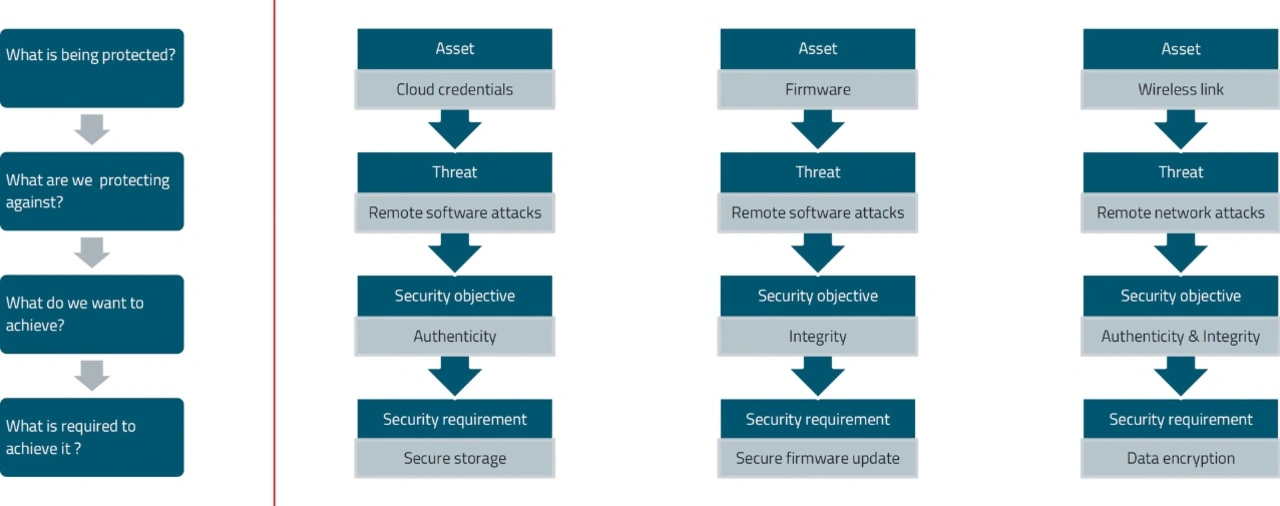 Beim Entwurf eines Sicherheitskonzepts für ein Embedded-Gerät sind einige Fragen zu stellen und zu beantworten: Welches Asset braucht Schutz? Wie sieht die Bedrohung aus? Welches Sicherheitsziel haben wir? Was brauchen wir dafür? Bild 6 verdeutlicht diese Sicherheitsanforderungen für unterschiedliche Assets. Der aktuelle Stand von Maßnahmen zur Gewährleistung der Cybersicherheit in einer beliebigen IoT-Anwendung umfasst eine Reihe von Sicherheitselementen: