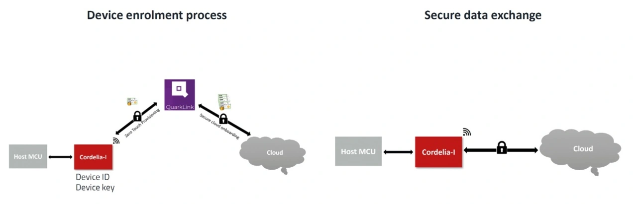 Bei diesem Prozess wird das Gerät mit allen Parametern konfiguriert, die für die Verbindung mit der Cloud-Plattform erforderlich sind, einschließlich der kryptografischen Ressourcen, ohne dass ein Mensch eingreifen muss. Dies umfasst die Konfiguration mehrerer Parameter einschließlich der oben erwähnten kryptografischen Assets im Gerät. Das Cordelia-I-Modul ermöglicht zusammen mit der QuarkLink-Plattform eine berührungslose Bereitstellung im Feld. Jedes Modul wird mit einem einzigartigen, vorinstallierten und hardwaremäßig manipulationssicheren Schlüsselsatz geliefert.