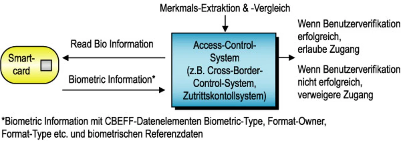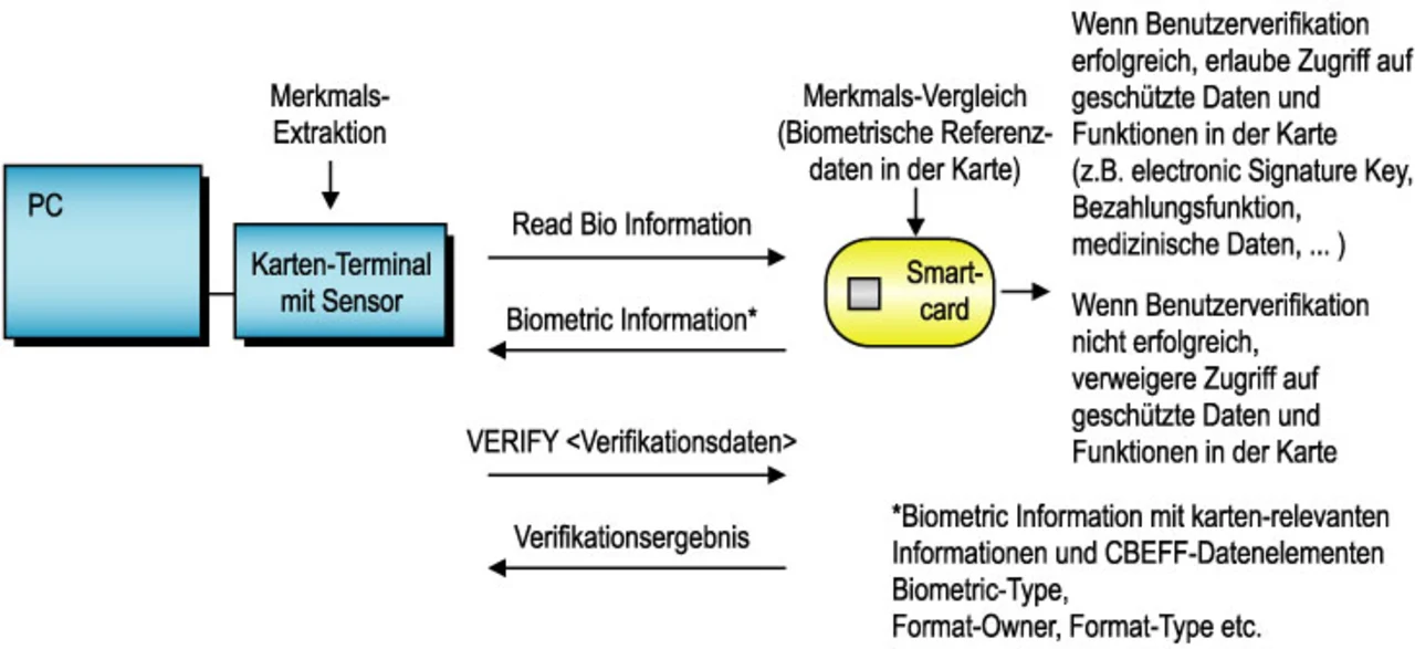 Eine biometrische Erkennung beruht auf dem Vergleich von aktuell erfassten biometrischen Verifikationsdaten einer Person mit gespeicherten Referenzdaten derselben Person. Die Rolle der Smartcard kann dabei aus biometrischer Sicht durchaus unterschiedlich sein. Wichtig ist hierbei immer die Anforderung, wo der Zustand „Benutzer-Verifikation erfolgreich/nicht erfolgreich“ verwendet wird. Das muss eine Spezifikation der Kommandos und Datenobjekte an der Schnittstelle zur Smartcard berücksichtigen.