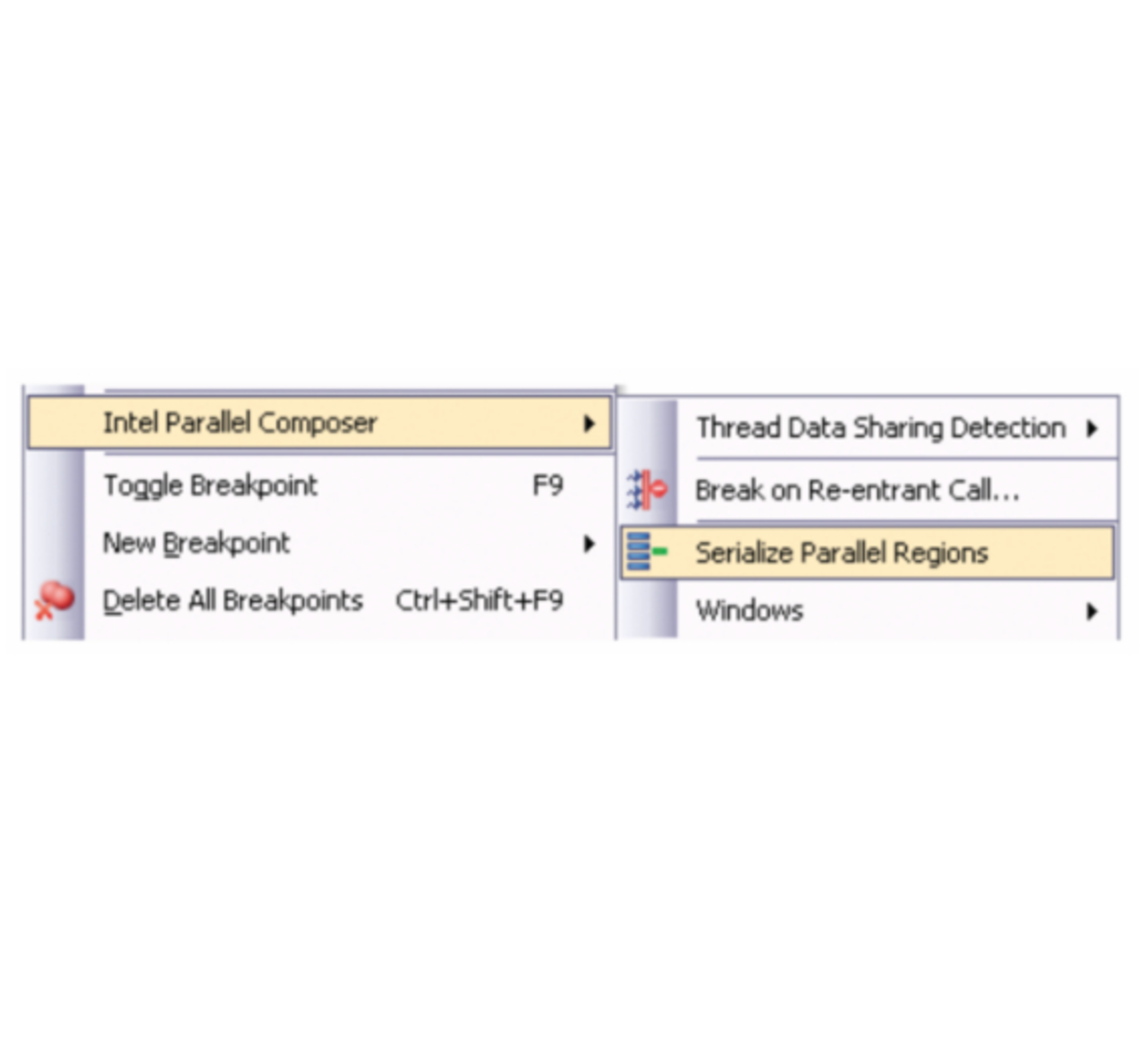 Die Intel Parallel Debugger Extensions, die Bestandteil der Tool-Komponente Parallel Composer sind, gehen einen Schritt weiter und vermeiden diesen Nachteil. Sie bieten an, OpenMP-Programmteile seriell ablaufen zu lassen, indem die Anweisung „Serialize Parallel Regions“ (siehe Bild 1) eingefügt wird. Ein zweiter Modus erlaubt der Parallel Debugger Extension sogar ein schrittweises, deterministisches Abarbeiten von Open- MP-Code.