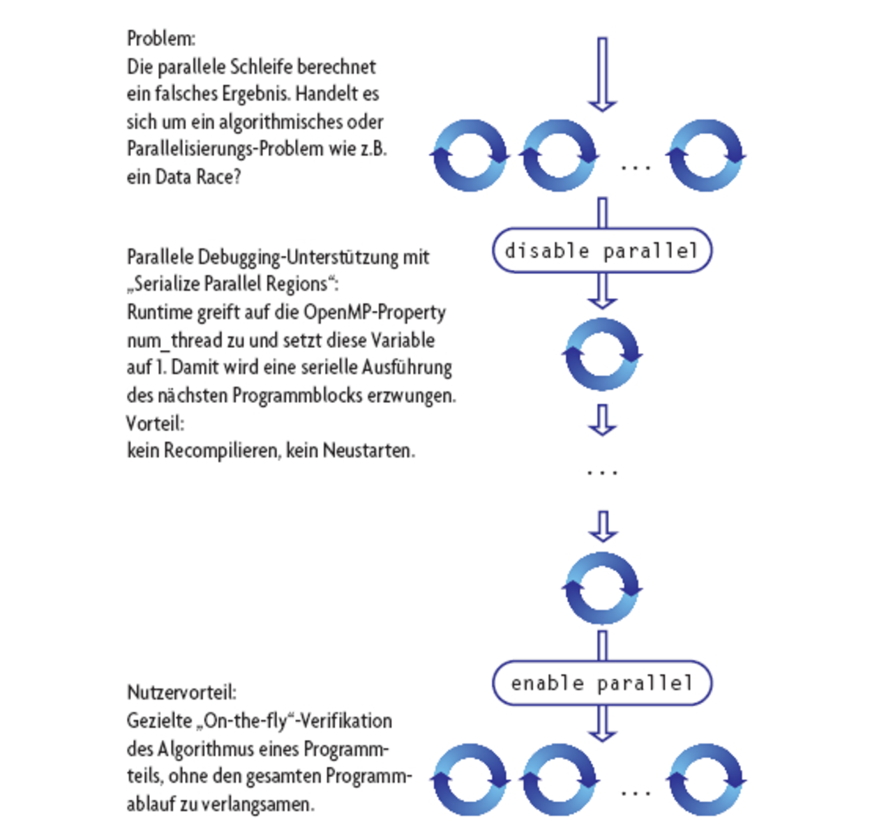 Bisher hatte der OpenMP-Ansatz eine relativ einfache Möglichkeit, das parallele Programm zu Testzwecken kurzzeitig zu serialisieren (also auf einen Thread limitiert) und damit nicht-deterministische Fehlerquellen auszuschließen. Lediglich die seriellen Bugs werden bearbeitet. Erst wenn diese seriellen Bugs beseitigt sind, wendet man sich den parallelen Bugs zu und schaltet den seriellen Modus wieder ab.