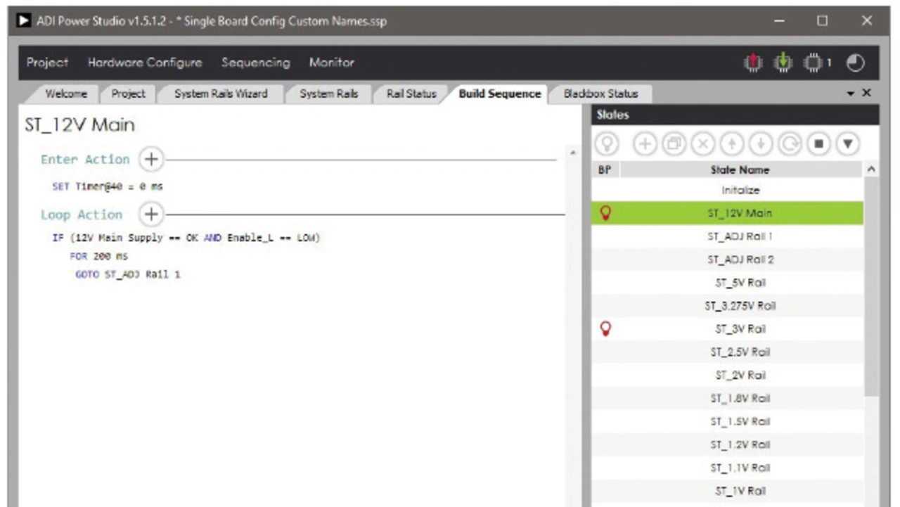 Entwickler können eine Sequenz auch schrittweise durchlaufen, indem sie bei allen Zuständen Breakpoints setzen. Diese Einzelschritt-Fehlersuche (Single Stepping) kommt etwa zur Überprüfung von Pre-Bias Start-ups für Spannungsschienen zum Einsatz, bevor sie aktiviert werden. Entwickler können in einzelnen Schritten die Stromversorgungssequenz durchlaufen, um zu erkennen, ob an den Ausgängen von vermutlich deaktivierten Spannungsschienen Spannungen anliegen, die im Monitorfenster der Software angezeigt werden. Bild 4 zeigt ein Beispiel für benutzerdefinierte Breakpoints.