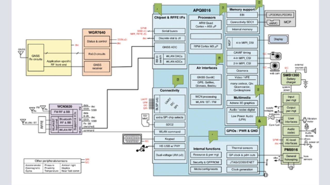 Gefertigt wird der Prozessor in einem 28-nm-Low-Power-Prozess. Damit bietet der Snapdragon laut Hersteller eine sehr gute Balance zwischen Performance und Verlustleistung. Neben dem Prozessor selbst liefert Qualcomm auch die entsprechenden Support-Chips wie die Power-Management-Unit »PM8916«, der darüber hinaus auch den Audio-Codec enthält, das HF-Frontend »WCN3620« für Wi-Fi (IEEE 802.11 b/g/n) sowie Bluetooth 4.1 (Basic und Enhanced Data Rate) und Bluetooth Low-Energy. Dazu kommt noch das GNSS-Frontend (Global Navigation Satellite System) »WGR7640«, das alle derzeit verfügbaren Systeme wie GPS, Galileo, Glonass und Beidou unterstützt. Bild 1 zeigt einen Überblick zur Systemarchitektur.