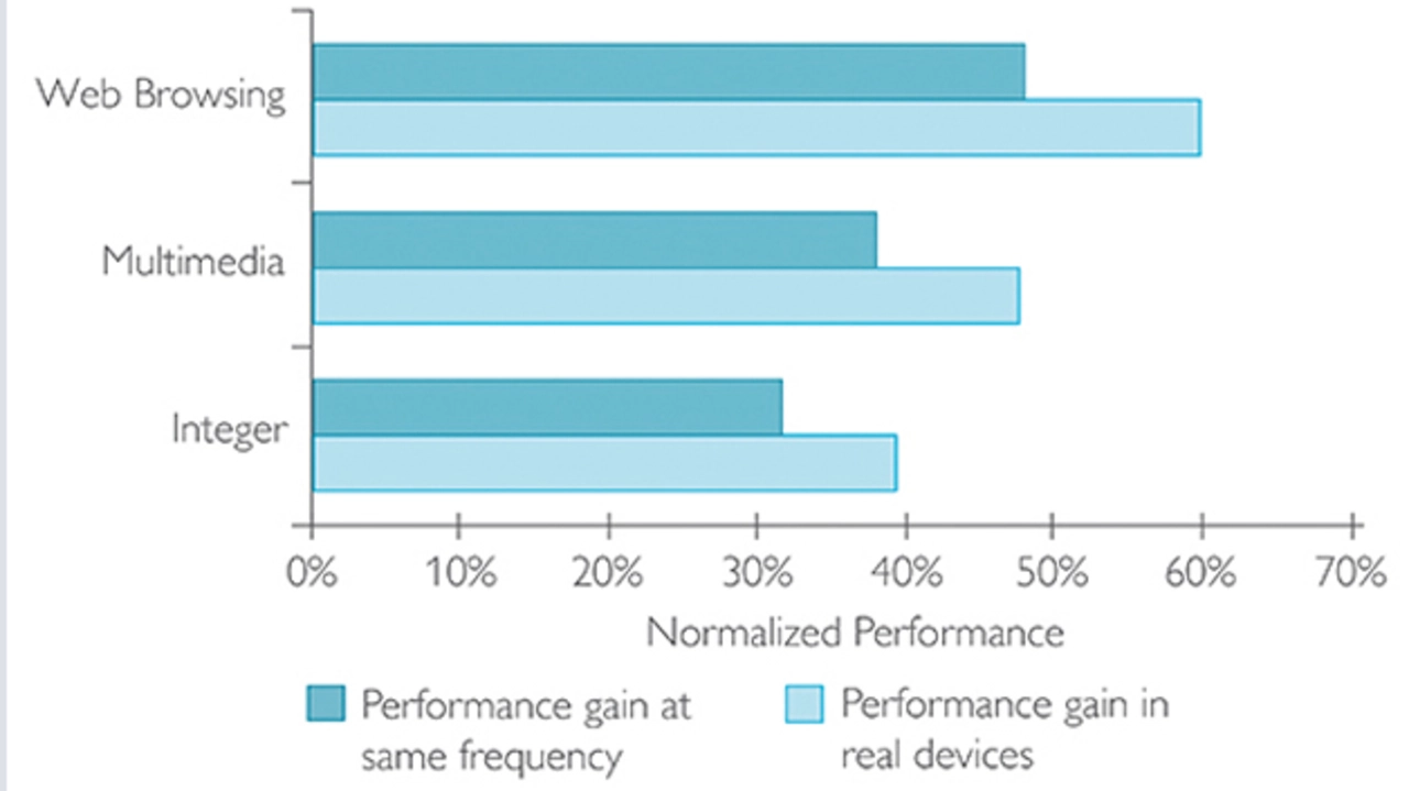 Der Cortex-A53 liefert dabei eine signifikant höhere Leistung (ca. Faktor 1,5 bei gleicher Taktfrequenz) als der bereits erfolgreich am Markt eingeführte Cortex-A7 (Bild 2), als dessen technologischer Nachfolger er zu sehen ist.