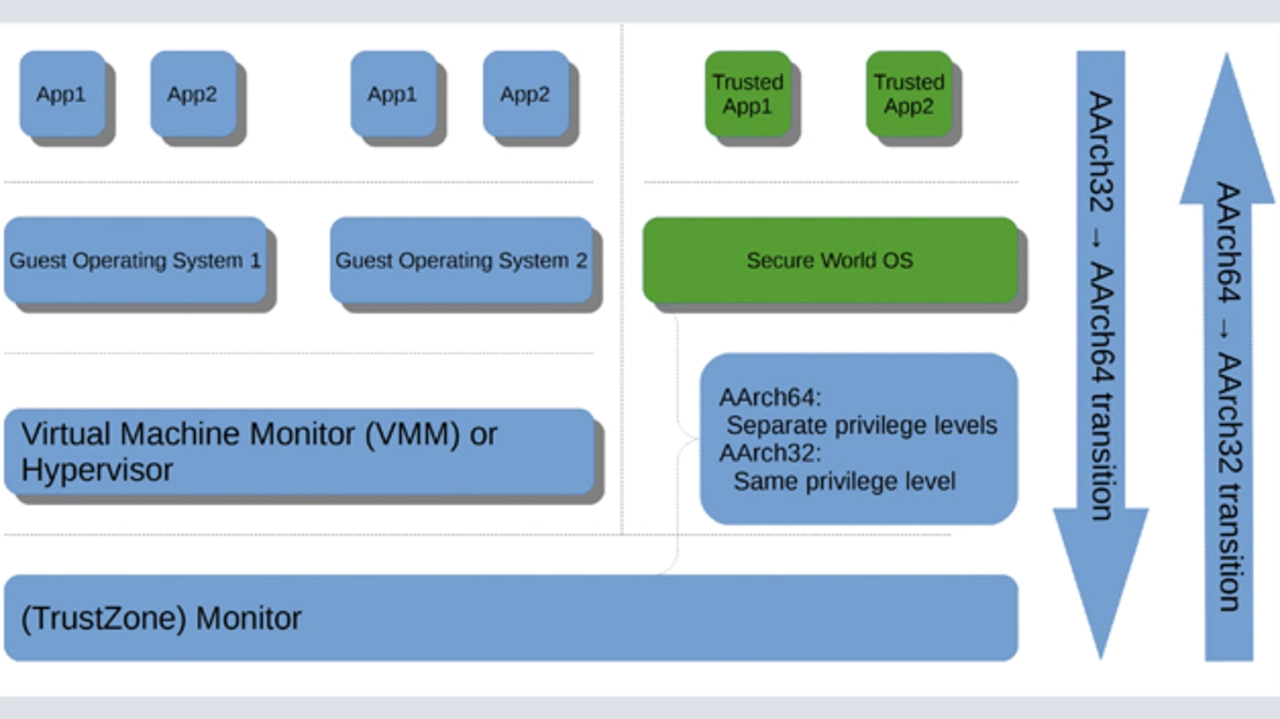 Als weitere Neuerung steht damit den Entwicklern nun auch Hardware-Unterstützung für Virtualisierungslösungen wie KVM durch die neu eingeführten zusätzlichen »Privilege Levels« zur Verfügung (Bild 3). Dies macht vollkommen neue Ansätze möglich, die Applikations-Software zu partitionieren. Beispielsweise können zeitkritische Prozesse in einer RTOS-Instanz laufen und die Ausgabe der Nutzerschnittstelle in einer hiervon entkoppelten Instanz unter Linux/QT oder Android erfolgen.Damit steht zu erwarten, dass auch der industrielle Einsatz von Android zunehmend interessant wird.
