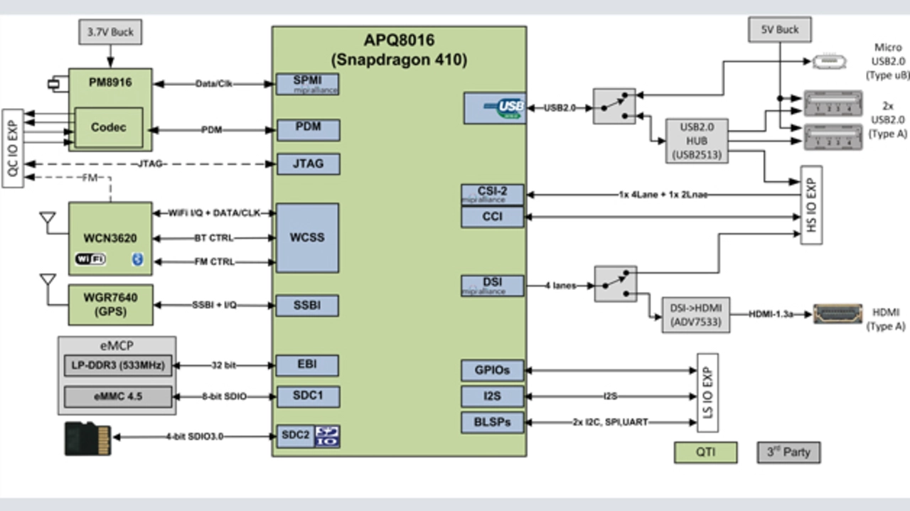 Das Dragonboard 410c wird von Android 5.1, Linux (basierend auf »Ubuntu«) und »Windows 10 IoT Core« unterstützt. Als Bootloader kommt derzeit »littlekernel« zum Einsatz, eine u-boot-Implementierung ist bereits in Arbeit. Das Board (Bild 4) verfügt über 1 GByte LPDDR3-Speicher mit 533 MHz, 8 GByte eMMC 4.5, integriertes Wi-Fi, Bluetooth und GPS, alles integriert auf dem Formfaktor »96boards CE«. Neben dem CE-Formfaktor (Consumer Edition), der auf mobile, eingebettete und industrielle Anwendungen abzielt, existiert noch ein Enterprise-Edition-Formfaktor (EE), der für Highend-Embedded, Networking sowie Server-Applikationen konzipiert wurde. Spezifikationen für beide Varianten sind unter [1] zu finden.