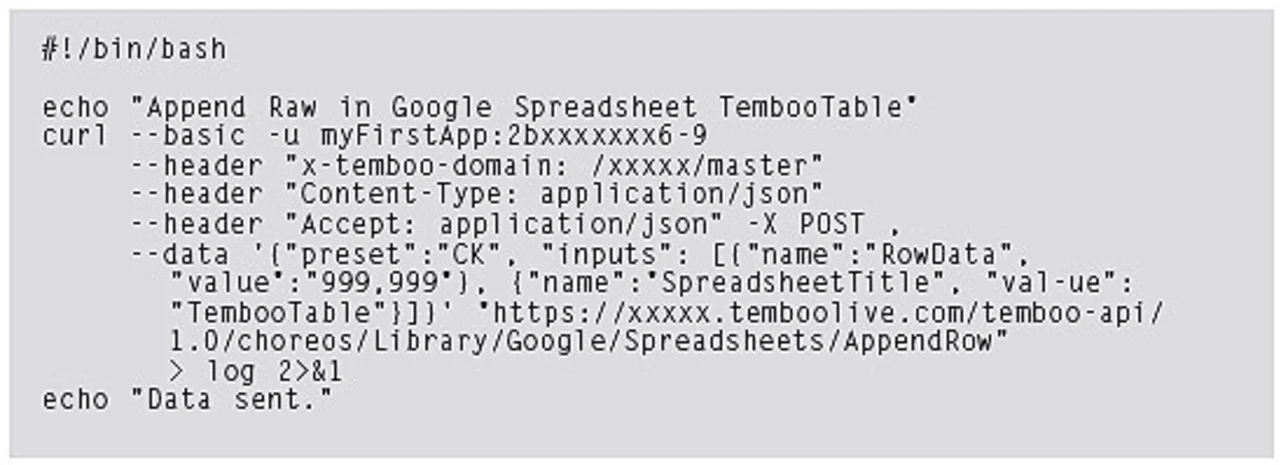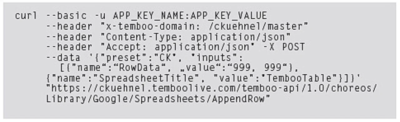 Nach diesem erfolgreichen Test wird die cURL-Kommandozeile generiert. Nach dem Selektieren von cURL wird diese generiert und kann in ein Shell-Script übernommen werden. Die Darstellung in Listing 2 ist aus Gründen der besseren Lesbarkeit etwas formatiert worden. cURL erwartet alle Argumente in einer Zeile. Die Argumente APP_KEY_NAME:APP_KEY_VALUE sind noch durch den vorher in Temboo erzeugten Application Key zu ersetzen. Der Aufruf eines Choreos ist meistens mit dem Aufruf verschiedener „Sub-Choreos“ verbunden. Vom Choreo AddRaw werden weitere Choreos aufgerufen, was aber für den Anwender vollkommen verborgen bleibt: