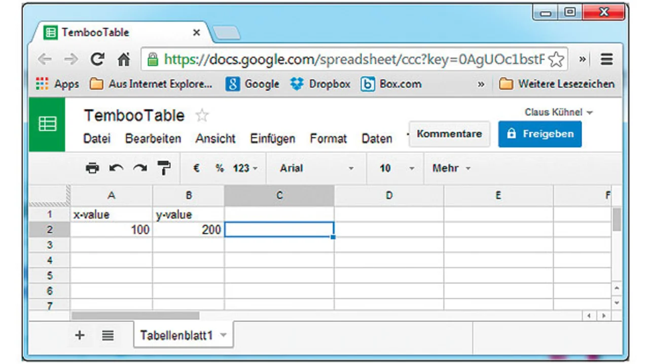 Im nächsten Programmbeispiel werden vom UDOO erfasste Daten in einer Google-Tabellenkalkulation zur weiteren Auswertung abgelegt. Hierzu hat der Autor in Google Docs die Tabelle Temboo Table erstellt, die aus zwei Spalten besteht, die in der ersten Zeile beschriftet sind (Bild 1).