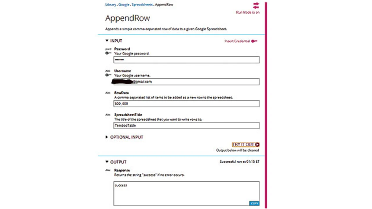 Nach dem Login auf der Webpräsenz https://temboo.com kann nun durch Aufruf von Library > Google > Spreadsheet das AppendRow-Choreo (Hinzufügen einer Zeile) aufgerufen werden. Das AppendRow-Choreo übergibt eine Zeile von kommagetrennten Daten an die Google-Tabellenkalkulation. Bild 2 zeigt, wie der AppendRow-Choreo in der Library getestet werden kann. Dabei muss darauf geachtet werden, dass der Run Mode aktiv ist (Run Mode is on). Im Bereich Input sind nun zuerst die Google-Zugangsdaten einzugeben. Diese Daten können abgespeichert werden und lassen sich dann über „Insert Credentials“ jederzeit wieder aufrufen.