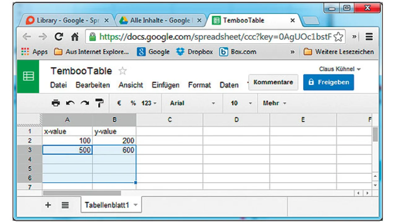 Im Feld „Raw Data“ werden, durch Komma getrennt, die Daten für die neue Tabellenzeile eingetragen – hier „500, 600“. Als letztes ist noch der Name der Tabelle einzugeben (hier TembooTable). Ein Klick auf das Feld TRY IT OUT sendet nun die aufbereiteten Daten über Temboo an die Tabellenkalkulation. Durch die Rückmeldung „success“ im Feld „Response“ wird die ordnungsgemäße Funktion angezeigt. Besser ist es aber allemal, sich in der Tabellenkalkulation selbst vom Erfolg zu überzeugen (Bild 3).