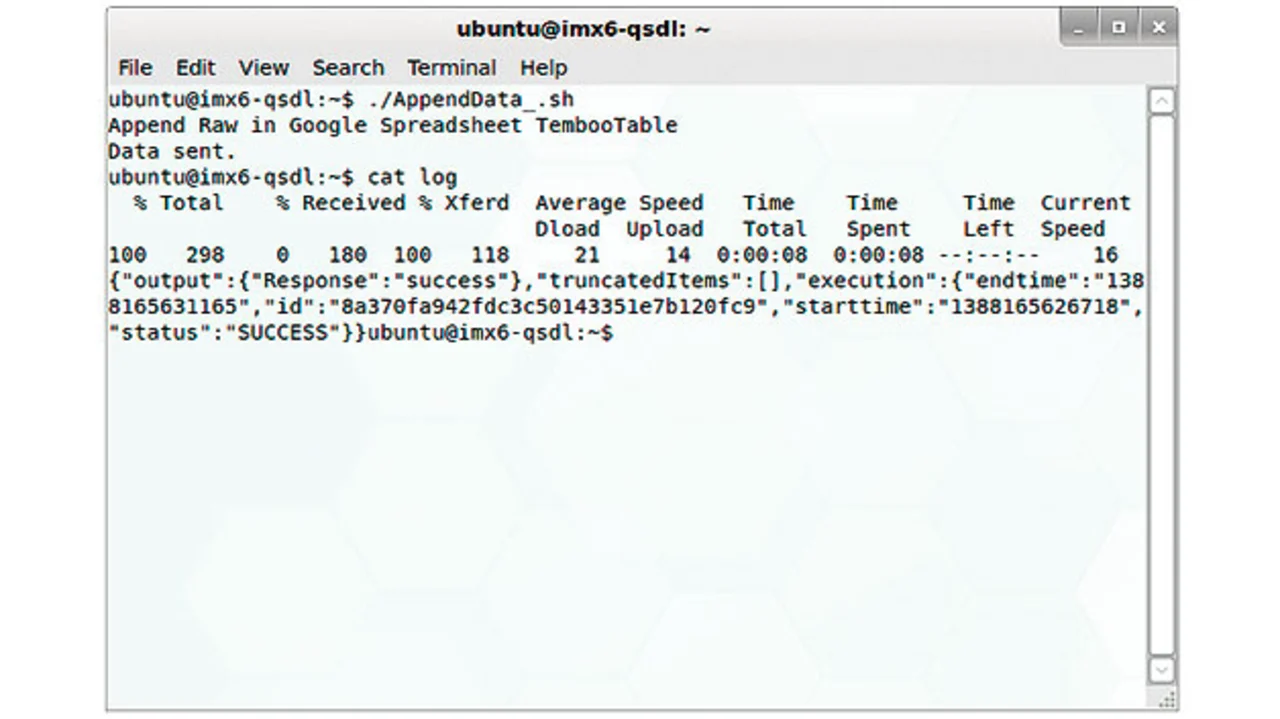 Bild 4 zeigt nun den Aufruf des Scripts AppendData_.sh (das ist die Scriptversion ohne xxxx) und seine Ausgaben. Um das Ergebnis zu verifizieren, zeigt uns der Inhalt der Datei log durch “Response“:“success“ den Erfolg der Operation an. Für das Hinzufügen der Daten wurden insgesamt ca. acht Sekunden benötigt.