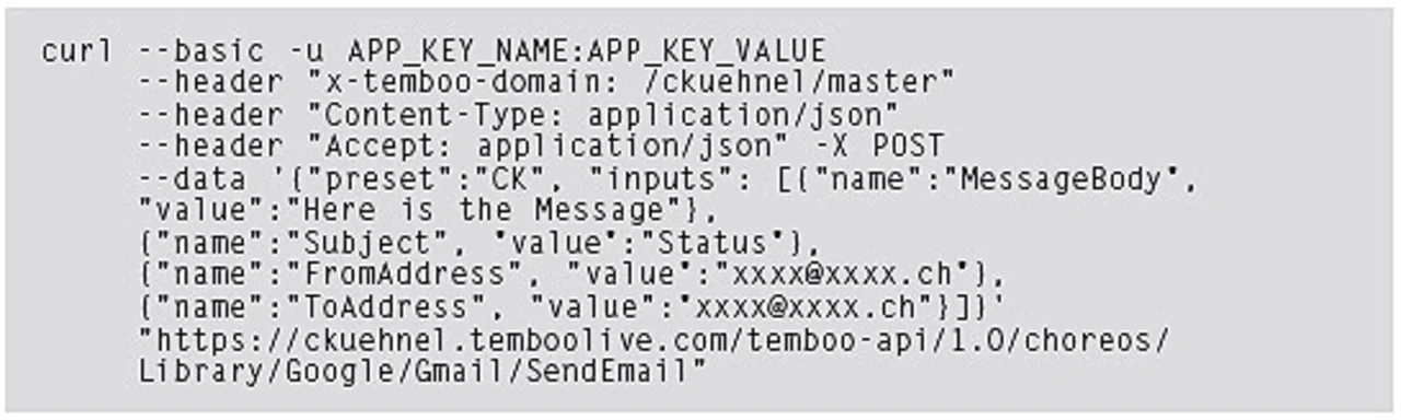 Gmail ist Googles kostenloser E-Mail-Dienst und gilt seit Mitte 2012 als der weltweit meistge-nutzte. Am Anfang dieses Beitrags wurde bereits gezeigt, wie über den Aufruf eines Shell-Scripts eine E-Mail versendet werden kann. Über Temboo kann man diesen Dienst ebenfalls nutzen. Hierzu steht das Choreo „Sendmail“ zur Verfügung. Das erforderliche cURL-Kommando wird wieder über die Temboo-Webpräsenz erzeugt und ist hier aus Gründen der besseren Lesbarkeit in Listing 4 etwas formatiert worden – cURL erwartet alle Argumente in einer Zeile. Die Argumente APP_KEY_NAME:APP_KEY_VALUE sind noch durch den Application Key zu ersetzen. Ausserdem wurden die E-Mail-Adressen von Sender und Empfänger wieder durch xxxx unkenntlich gemacht. Der eigentliche Inhalt der E-Mail steht in den Feldern „Subject“ und „MessageBody“.