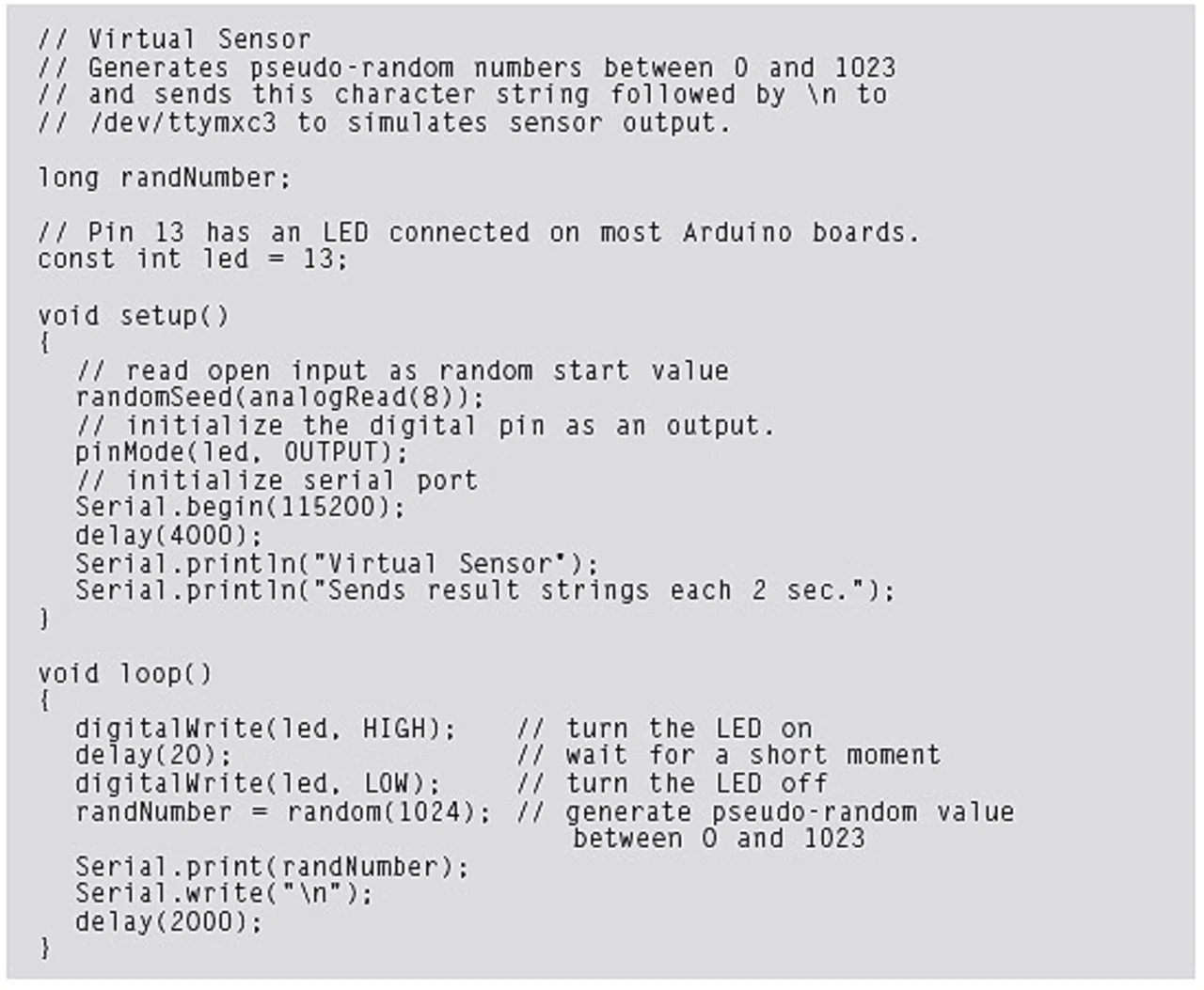 Der E-Mail-Versand ist in ein als Statusmonitor fungierendes Programmbeispiel eingebettet worden. Auf der Arduino-Seite läuft ein Programm, welches einen Sensor abfragt und das Ergebnis über die serielle Schnittstelle an das Linux-Device sendet. Für die Inbetriebnahme wurde dieses Programm durch eine Simulation vs.ino (Listing 5) als virtueller Sensor ersetzt. Hier wird der zu übertragende Sensorwert im Bereich von 0 bis 1023 durch einen Pseudo-Zufallszahlengenerator erzeugt und im Abstand von ca. 2 s zum Linux-Device verschickt.