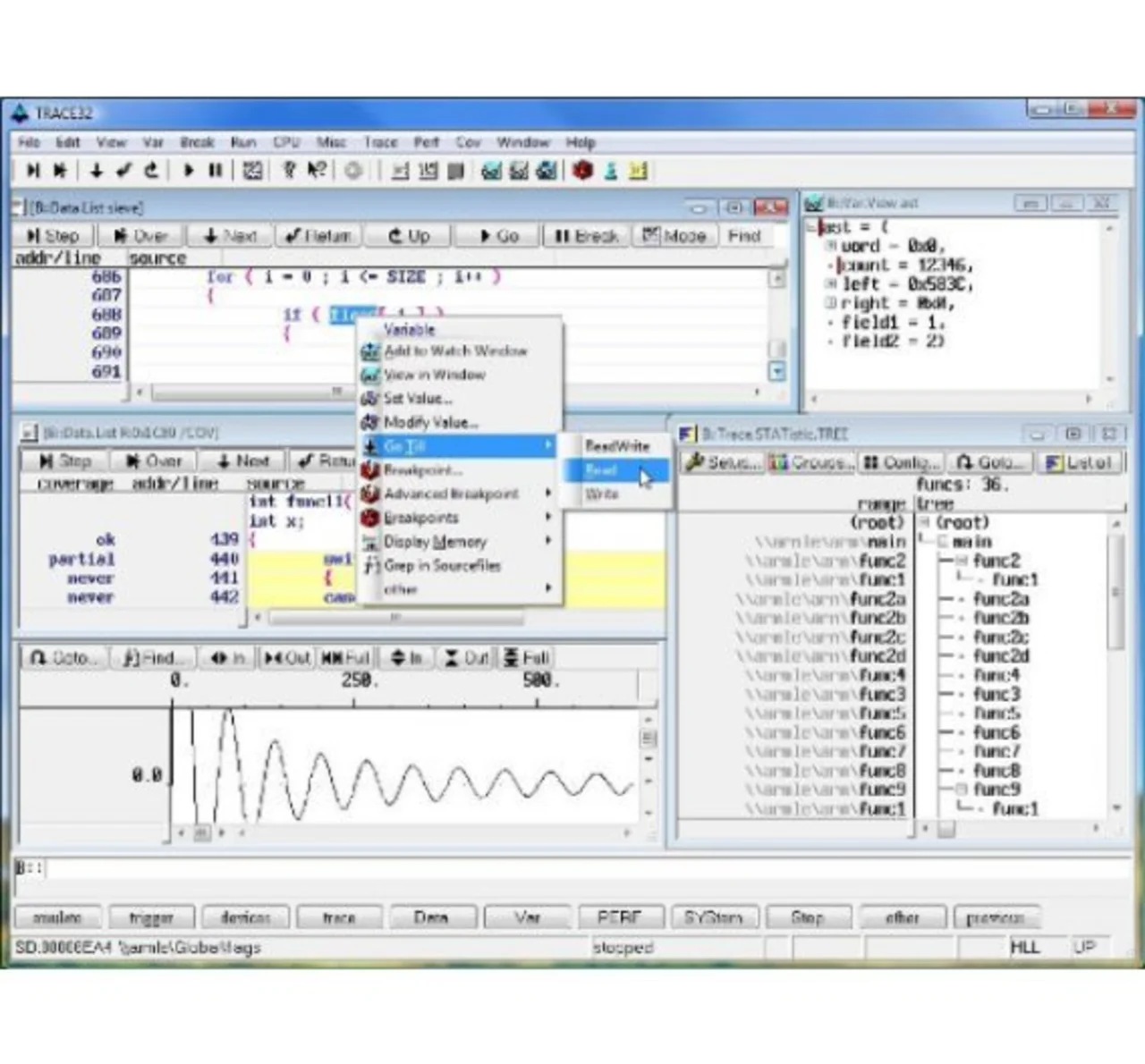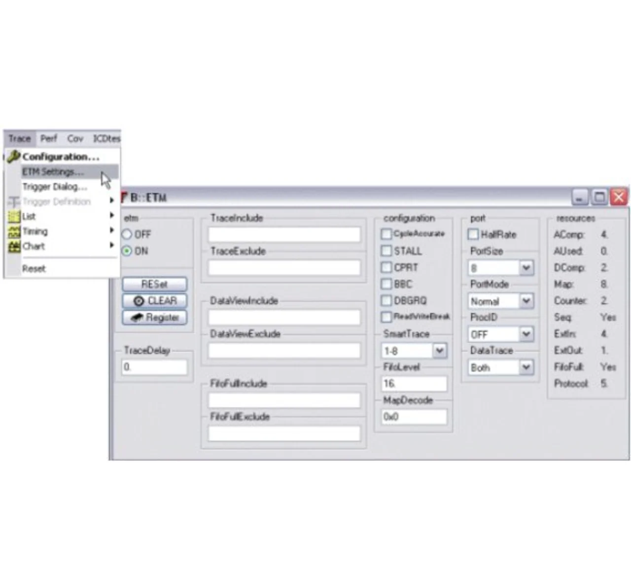 Für die Steuerung der elementaren Arbeitsabläufe mag die Eclipse-Entwicklungsumgebung bevorzugt werden. Für mehr ins Detail gehende, speziellere Aktivitäten wie das Einrichten und Durchführen von Traces mit der ARM Embedded Trace Macrocell (ETM) lässt sich der TRACE32 jedoch auch auf einer etwas maschinennäheren Ebene steuern, wie Bild 4 zeigt.