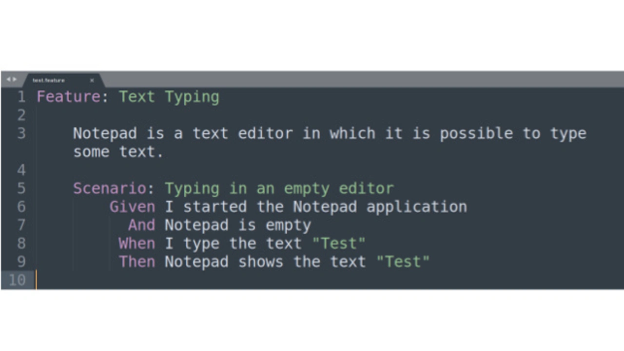 Die wohl bekannteste Programmiersprache für BDD ist Gherkin. Gherkin ermöglicht das standardisierte Erstellen von BDD-Anweisungen, die für Mensch und Maschine verständlich sind. Die Gherkin-Integration von Squish ermöglicht, Tests in Gherkin-Sprache aufzunehmen und abzuspulen. Eine Testbeschreibung mit dem Windows-Notepad in Squish zeigt Bild 4: das illustriert, wie verständlich Gherkin selbst ohne Programmierkenntnisse ist.
