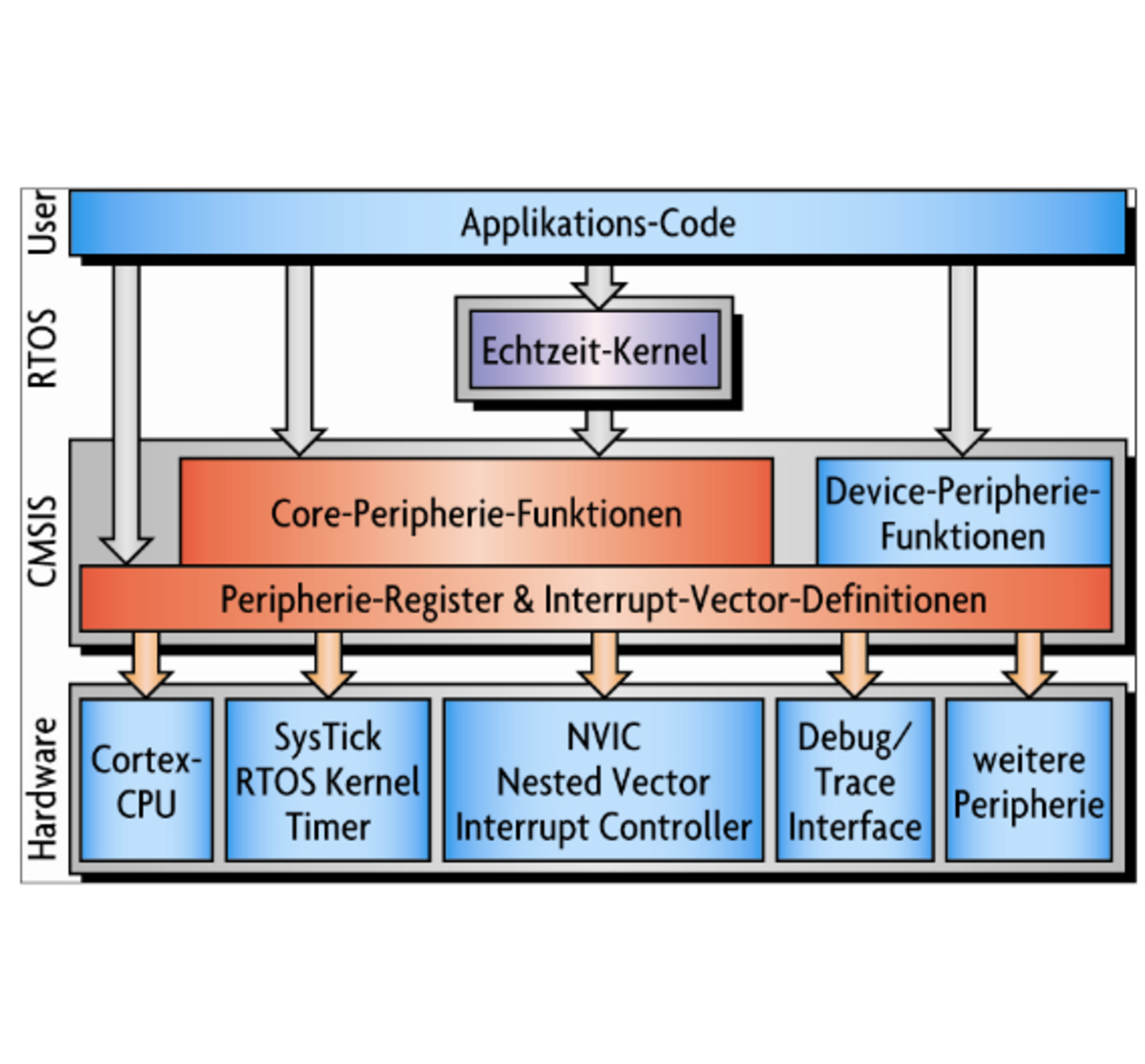 Jeder Mikrocontroller hat ein individuelles Sortiment von Peripherie. Damit auf diese Peripherie einheitlich zugegriffen werden kann, hat ARM den Schnittstellen-Standard CMSIS für Cortex-M-Controller geschaffen, der von allen wichtigen Halbleiter- und Tool-Herstellern unterstützt wird. CMSIS erleichtert und vereinheitlicht die Programmierung verschiedener Derivate und Prozessor-Generationen.