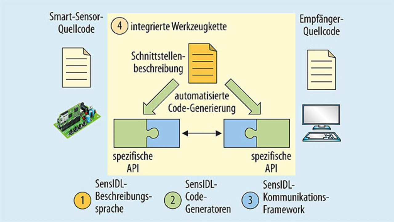 Im Forschungsprojekt SensIDL (Sensor Interface Definition Language) wurde eine Möglichkeit geschaffen, mit der sich Kommunikationsschnittstellen in Sensorsysteme einfacher implementieren lassen. Seit Anfang 2017 ist nun Release 1.0.0 als Open-Source-Projekt frei verfügbar.