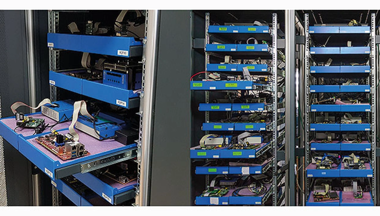 Für die unternehmenseigene Softwareentwicklung hat iSystem in seinen »iSystem Labs« Testracks mit mehr als 150 Einzeltestplätzen, verteilt auf Schubladen in mehreren Testschränken, eingerichtet (Bild 3). Diese bestehen jeweils aus dem Testframework mit der BlueBox und einem Embedded-Zielsystem. Alle Einschübe haben eine Stromversorgung und können dadurch einzeln und ferngesteuert runter- und wieder hochgefahren werden.