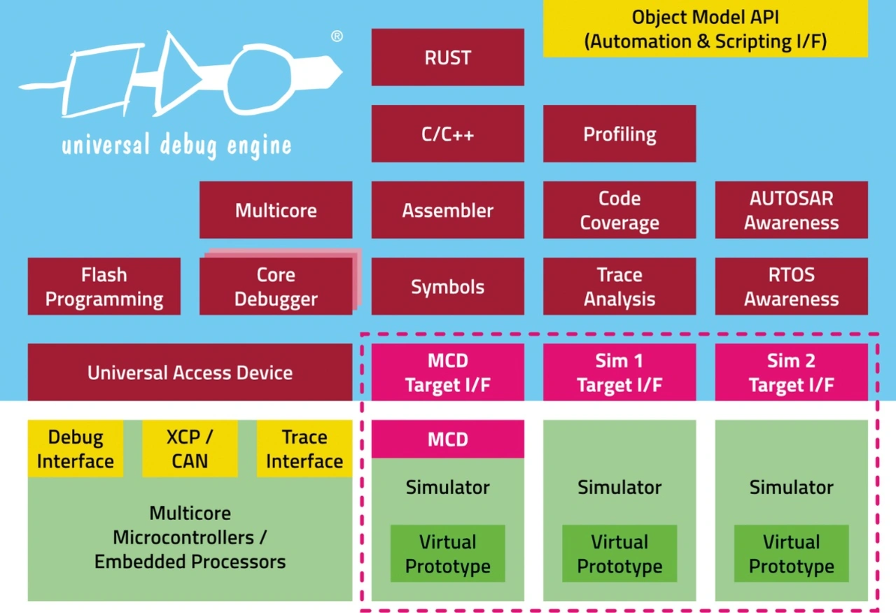 Die Kommunikation mit der Simulatorsoftware stellt für entsprechend leistungsstarke und flexible Debugger wie der UDE keine große Herausforderung dar. Dafür bieten die Simulatoren entweder ein proprietäres Interface an (Software-API) oder greifen auf das MCD-Interface (Multi-Core Debug API) zurück. MCD ist eine standardisierte leistungsfähige, aber trotzdem einfache C-Schnittstelle, die Debuggern den Zugriff auf reale oder simulierte Multicore-Systeme ermöglicht. In der UDE ist dafür ein sogenanntes Simulator-Target-Interface vorgesehen, das die MCD-Schnittstelle bedient und statt der Target-Interfaces für die reale Hardware durch die Debugger-Komponenten benutzt wird (Bild 3). Dadurch registrieren die Debugger-Komponenten gar nicht, dass sie gerade mit einem Simulator verbunden sind.