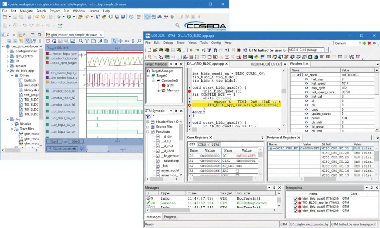 Eine deutliche komfortablere Möglichkeit für die Software-Entwicklung bietet hier der Virtual Prototype des GTM in der Entwicklungsumgebung COSIDE von COSEDA Technologies. Die UDE dient in diesem Beispiel als Frontend für ein komfortables Debugging der GTM-MCS-Applikationen (Bild 2). Die Simulation erfolgt unabhängig vom konkret eingesetzten Mikrocontroller, und die Anzahl nutzbaren Breakpoints ist prinzipbedingt unbegrenzt. Im Unterschied zum GTM in realer Hardware wird das gesamte GTM-Model bei Erreichen eines Breakpoints angehalten, was einem Einfrieren der Zeit gleichkommt. Somit hat das Debugging keinerlei Einfluss auf das Systemverhalten, ist also nicht-invasiv, und die Simulation ist zu 100 Prozent reproduzierbar.