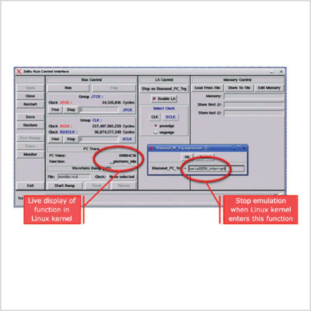 Sobald der Diamond-Prozessor diese Adresse ansprang, sollte ein Trigger ZeBu stoppen. Ein paar zusätzliche Zeilen TCL-Code (Tensilica-Befehle) in der Laufzeitumgebung »zRun« von ZeBu erlaubten es, den Funktionsnamen direkt einzugeben, sodass die GUI in der System. map nach der Hardware-Adresse suchen konnte. Nach dem Parsen der System.map in das assoziative Array »czrAddFrom-Sym« fügten die Entwickler dem TCL-Code von zRun zwei Zeilen hinzu, welche den Trigger-Input des Benutzers verarbeiten sollten (im Listing rot): Außerdem sollte ein zusätzliches Feld im GUI-Fenster dafür sorgen, dass ständig der aktuelle Funktionsaufruf des Kernels dargestellt würde (Bild 1). Allein zu sehen, wie der Funktionsname sich ständig änderte, war sehr aufschlussreich: Es wurde sofort sichtbar, wofür die CPU Rechenzeit aufwandte. Prinzipiell lassen sich auch ausgefeiltere Anwendungen implementieren, etwa störungsfreies Code-Profiling, besonders für kritische Abschnitte von Interruptvektoren, die sich mit anderen Methoden nur schwer untersuchen lassen.