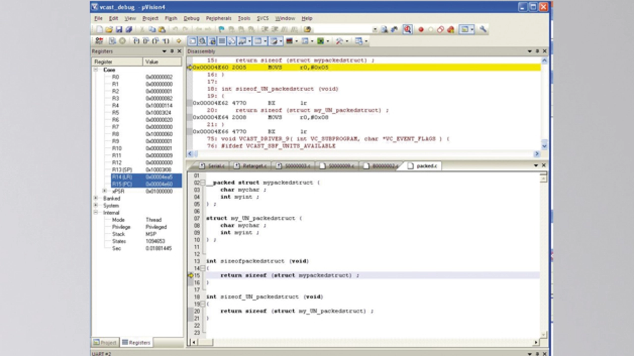Das Schlüsselwort __packed wird verwendet, um den Compiler von der Ausrichtung der Datenstrukturen auf Byte- oder Wortgrenzen abzuhalten, um eine effizientere Datenspeicherung zu erzielen, oder um ein Mapping auf eine externe Datenquelle zu erzielen. Im Beispiel in Bild 1 bewirkt dieses Schlüsselwort, dass sich die Größe des Struct-Typen von 8 Byte auf 5 Byte verringert, weil auf die Ausrichtung der Datentypen auf »Long Word« verzichtet wurde.