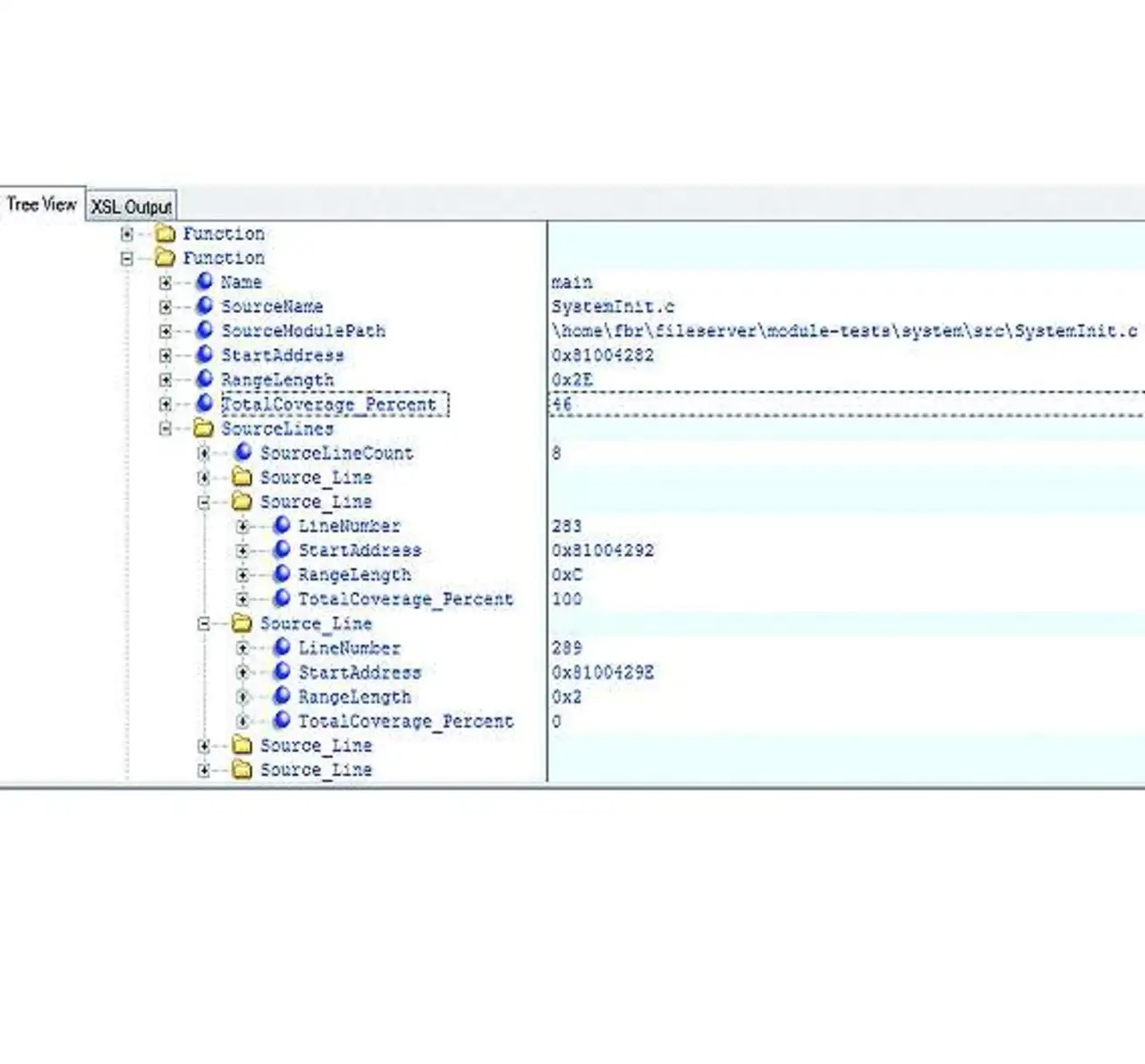 Ein Diagramm bietet die C0-Abdeckung auf Funktionsebene. Von diesem kann auf C0-Abdeckung auf Quelltextzeilen-Level verzweigt werden. Im Programm-Fenster ist darüber hinaus eine Anzeige bis auf den einzelnen Maschinenbefehl möglich. Noch wichtiger ist allerdings, dass die Daten einfach für eine Weiterverarbeitung in für die Zertifizierung spezialisierten Tools zur Verfügung stehen.