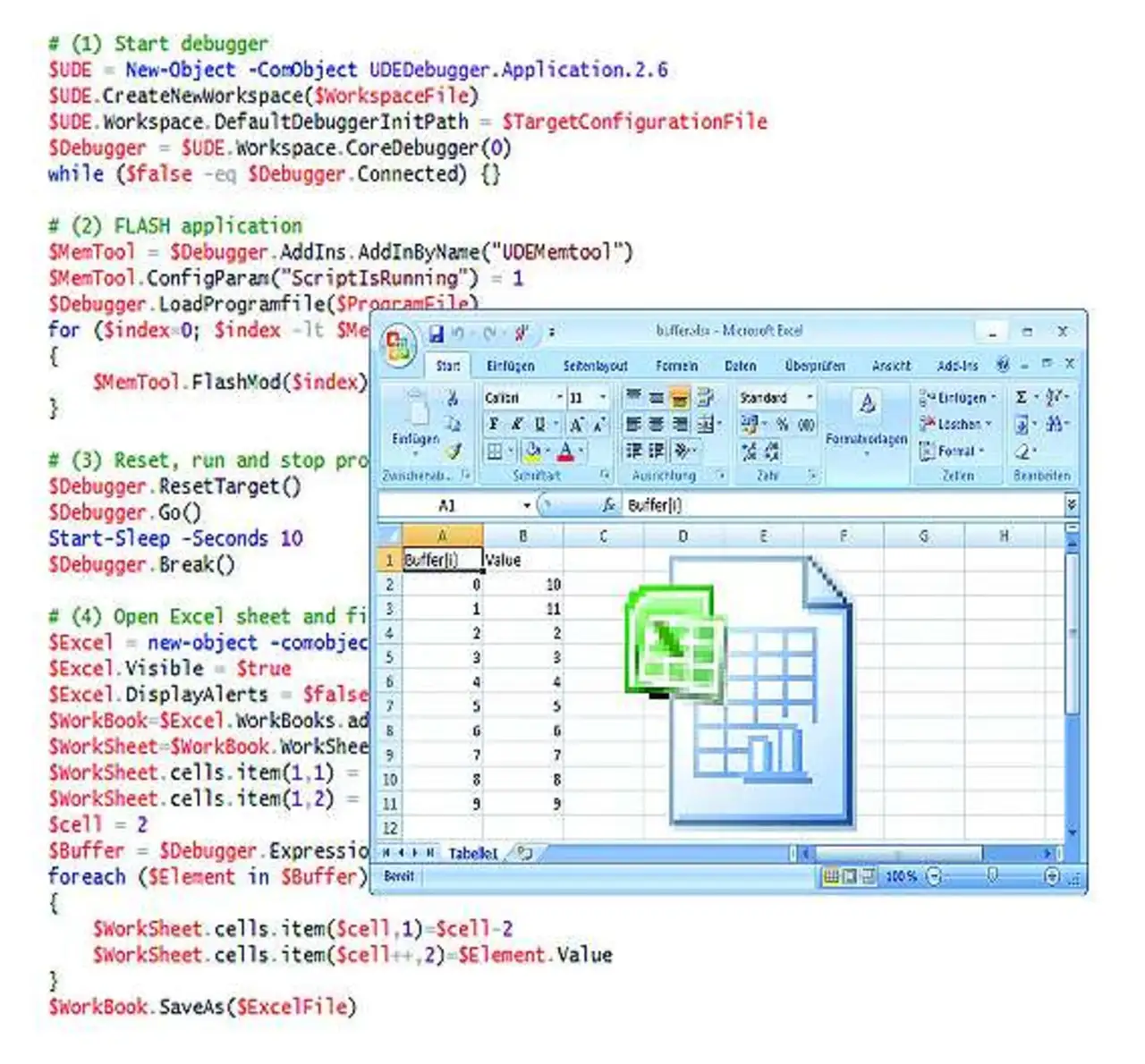 Als Objektmodell wird bei COM die Gesamtheit aller dokumentierten Objekte, Methoden, Eigenschaften und Datentypen bezeichnet. Damit lassen sich nahezu alle Funktionen der UDE inklusive Add-ins wie »UDE/MemTool« zur FLASH-Programmierung, CAN-Recorder oder Trace-Datenströme von intern oder extern durch Skripte steuern bzw. nutzen. Ein integrierter Skript-Debugger hilft bei der Erstellung korrekt ablaufender Automatisierungen.