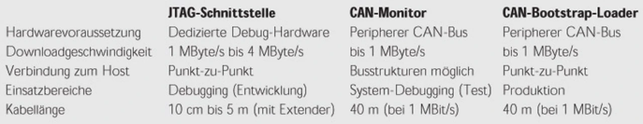 Eine weitere interessante Systemschnittstelle ist der CANBus. Ein entsprechendes Peripheriemodul mit standardisiertem Verhalten findet sich auf vielen Automotive-Mikrocontrollern. Die maximale Transferrate liegt bei 1 MBit/s (High-Speed-CAN). CAN ist bei Kfz-Steuergeräten oft die einzige im Seriengerät noch verfügbare Schnittstelle. Die Busstruktur erlaubt auch die gezielte Adressierung einzelner Knoten. Auch für den CAN-Bus gibt es Bootstrap-Loader-Implementierungen von verschiedenen Herstellern, zum Beispiel Infineon und STMicroelectronics. Da CAN keine Standardschnittstelle am PC ist, wird auch hier ein entsprechendes Kommunikationsgerät benötigt. Das Debuggen und Kalibrieren über CAN-Bus ist eine etablierte Arbeitsweise. Tabelle 1 zeigt einen Vergleich wichtiger Systemschnittstellen.