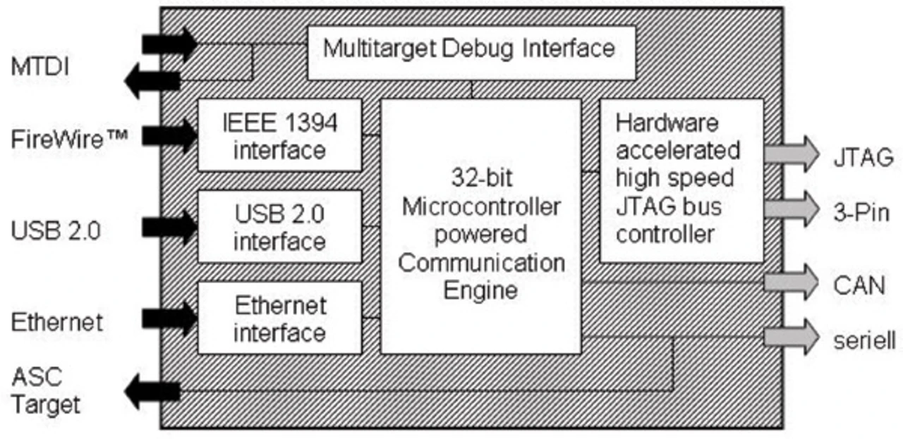 Bei den Systemschnittstellen bei Mikrocontrollern kann man zwischen dedizierten Debug-Schnittstellen und Standard-Peripherie unterscheiden. Dedizierte Debug-Schnittstellen sind vom Halbleiterhersteller explizit für den Systemzugang konzipiert und häufig funktional eng mit anderen On-Chip-Debug-Einheiten verbunden. Als Basis hat sich hier JTAG in verschiedenen Implementierungen durchgesetzt. Die Unterschiede liegen vor allem im Protokoll. Die unterste Kommunikationsschicht beruht immer auf dem Standard IEEE 1149.1. Abhängig von der Controller-Architektur und damit dem verwendeten Protokoll über die JTAG-Schnittstelle sind Brutto-Transferraten zum Target von maximal 1 MByte/s bis 3,5 MByte/s möglich. Um diese Leistungsfähigkeit voll ausschöpfen zu können, ist eine spezielle Kommunikationshardware nötig. Um die maximale Transferrate mit dem Target nicht durch den notwendigen Datenaustausch mit dem Host zu beeinträchtigen, sind moderne leistungsfähige PCSchnittstellen wie USB 2.0 mit 480 MBit/s, FireWire mit 400 MBit/s beziehungsweise Ethernet mit 100 MBit/s notwendig (Bild 1).