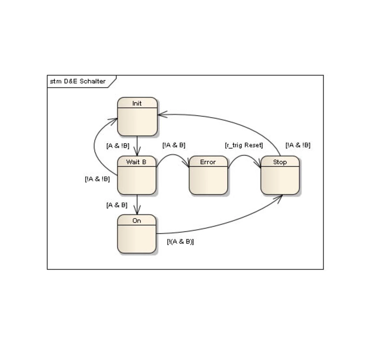 Die Verwendung einer DSL ist also in solch einem Fall nicht auf das Erzeugen von Maschinencode beschränkt. Für die Beschreibung des Automaten benötigt man die Menge der Ein- und Ausgangs-variablen, der Zustände und deren Übergänge. Dass dies nicht nur graue Theorie ist, zeigt die Modellierung von Funktionsbausteinen für Safety-Steuerungen, wie wir sie bei der PLCopen Safety Group finden [4].