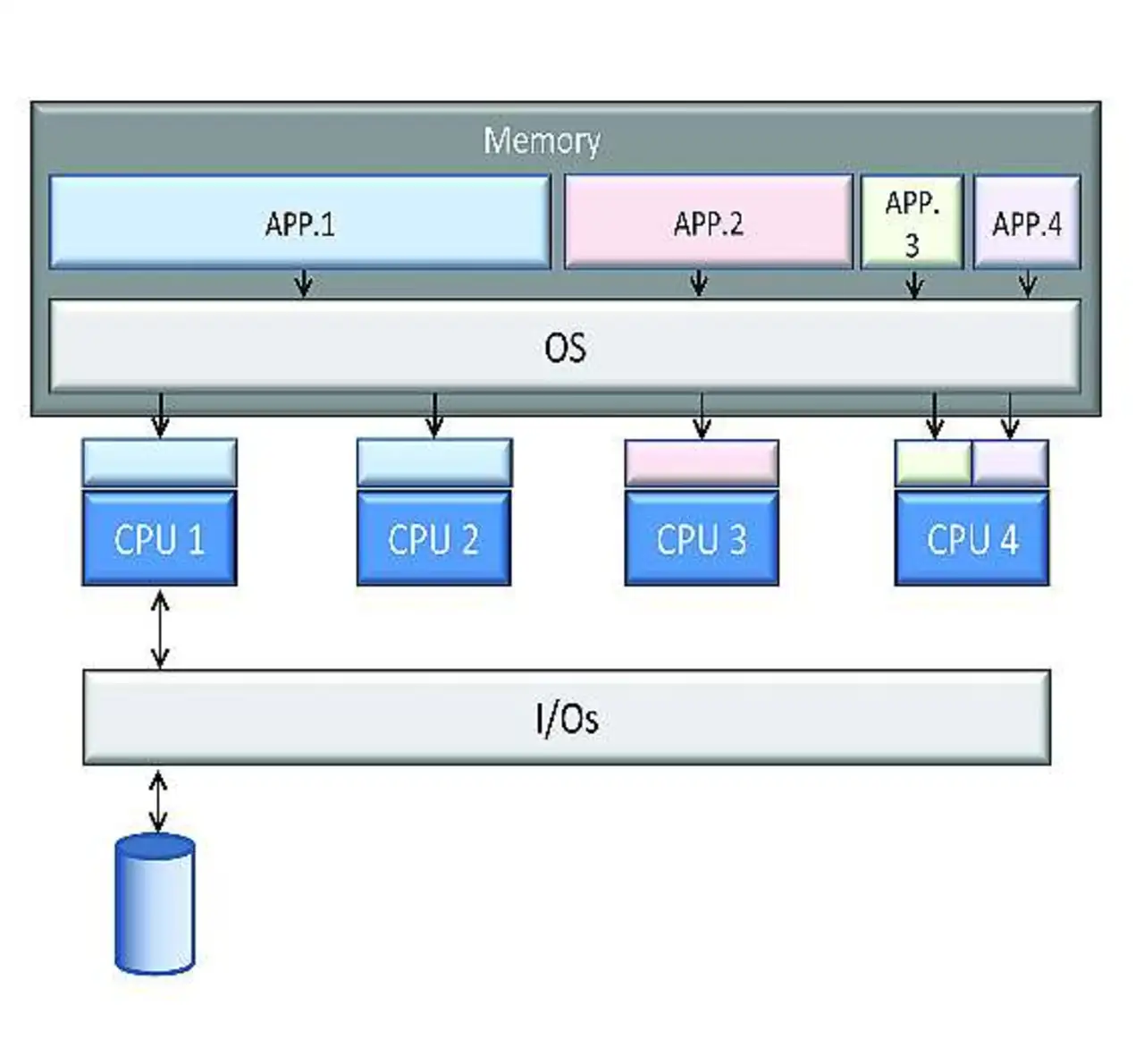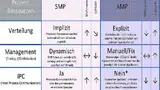 Der Betriebssystem-Scheduler sorgt dann dafür, dass die Threads möglichst gleichmäßig auf die vorhandenen Prozessorkerne verteilt werden. Das Betriebssystem verwaltet sämtliche I/Os und deren Interrupts, die typischerweise auch von allen Prozes-sorkernen erreichbar sind. Die Performance von SMP-Implementierungen wird begrenzt durch Engpässe beim Speicherzugriff und dem zusätzlichen Verwaltungsaufwand, der durch die Zuteilung auf die vorhandenen Prozessorkerne entsteht. Eine Daumenregel besagt, dass dieser Ansatz typischerweise ab mehr als sechs Kernen und einer größeren Anzahl von Applikationen schlechtere Ergebnisse liefert.