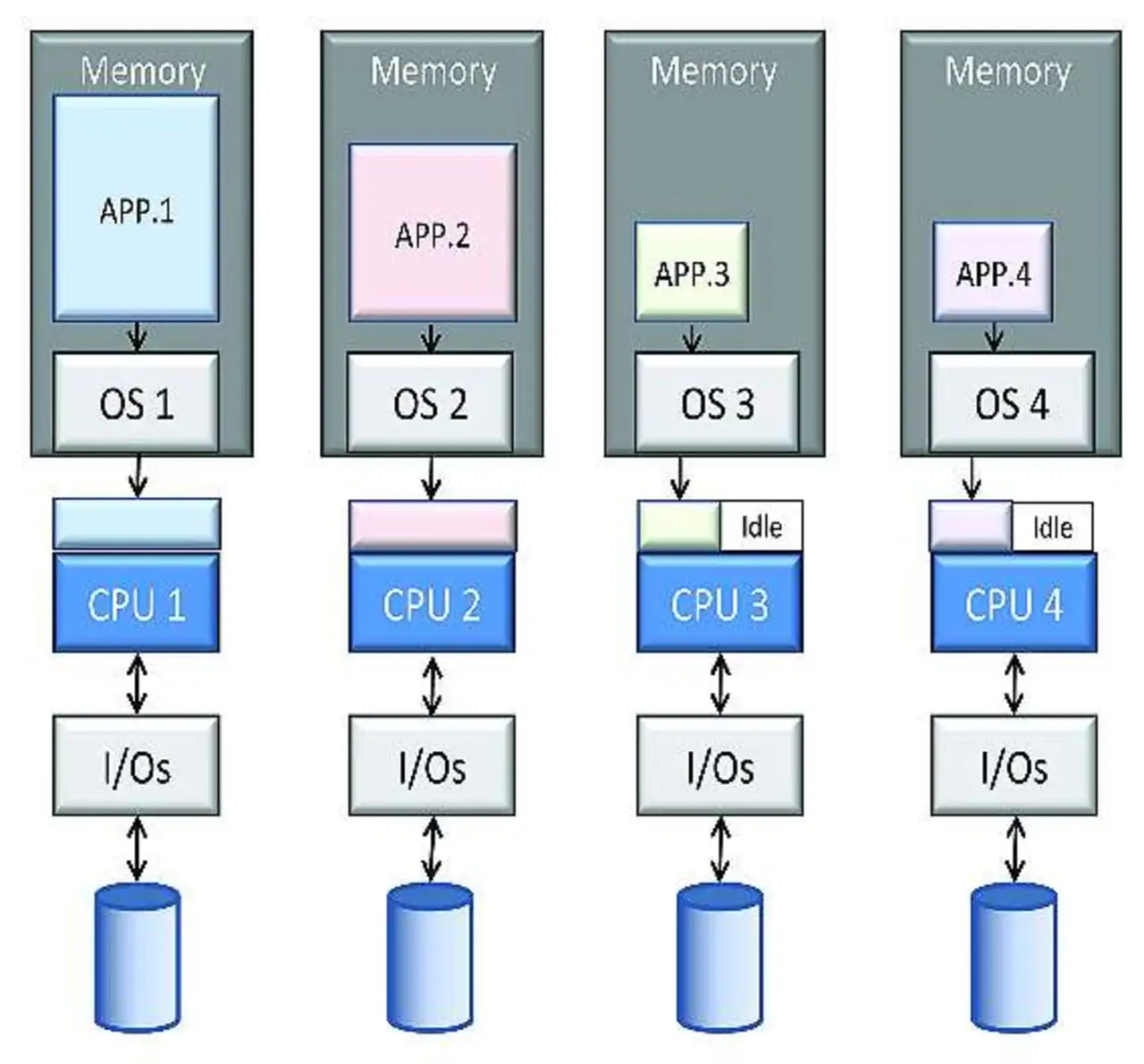 Bild 2 zeigt vier CPUs in einer AMP-Konfiguration. Jede CPU verfügt über ein eigenes Betriebssystem und über dediziertes I/O.