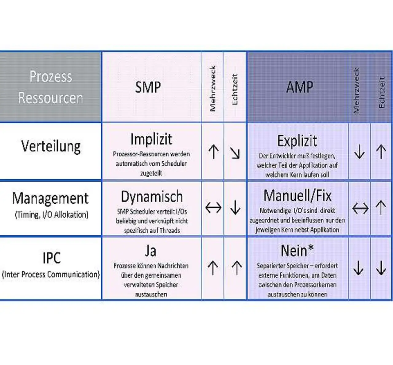 In der Vergangenheit wurden Echtzeitapplikationen immer in AMP-Umgebungen programmiert, wo auf jedem CPU-Kern ein oder auch gar kein Betriebssystem verwendet wurde und jeder Kern somit immer über eigene Ressourcen verfügte. AMP-Systeme haben den wesentlichen Vorteil, eine genau definierbare Umgebung mit vorhersagbarem Zeitverhalten zur Verfügung zu stellen - unbeeindruckt von anderen, davon unabhängigen Prozessen.