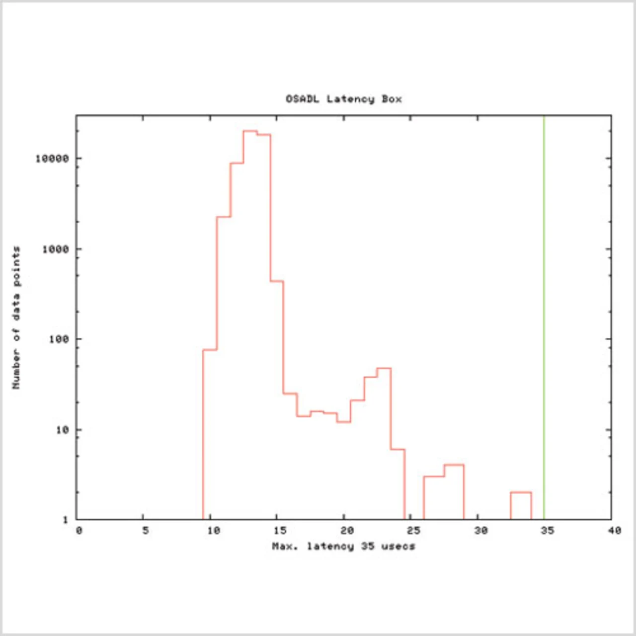 Die von der Firma Eltec Elektronik im Auftrag des OSADL entwickelte und gefertigte »Latency-Box« steht OSADL-Mitgliedern kostenlos leihweise zur Verfügung. Je nach Verfügbarkeit können allerdings auch Nichtmitglieder die »Latency-Box« nutzen beziehungsweise erwerben. Nach Abschluss einer Messung sind die Daten in Form einer ASCII-Datei über einen auf dem Gerät laufenden FTP-Server abrufbar. Die Rohdaten in dieser ASCII-Datei enthalten jeweils die Anzahl aufgetretener Latenzen mit einer Auflösung von 1 μs. Die weitere Verarbeitung der Daten erfolgt dann meist auf einem Desktop-PC. Für diesen Zweck stehen geeignete Skripts zur Herstellung grafischer Darstellungen mit Hilfe des Programms »gnuplot« zur Verfügung. Die Ausführung eines solchen Skripts ergibt eine Grafik, wie Bild 3 sie zeigt. Um eine optimale Beurteilung der Daten zu ermöglichen, ist die x-Achse (Latenzwerte) linear und die y-Achse (Anzahl an Messwerten pro Latenzwert) logarithmisch dargestellt. Der senkrechte Strich in grüner Farbe kennzeichnet die maximale Latenz, das wichtigste Ergebnis der Messung.