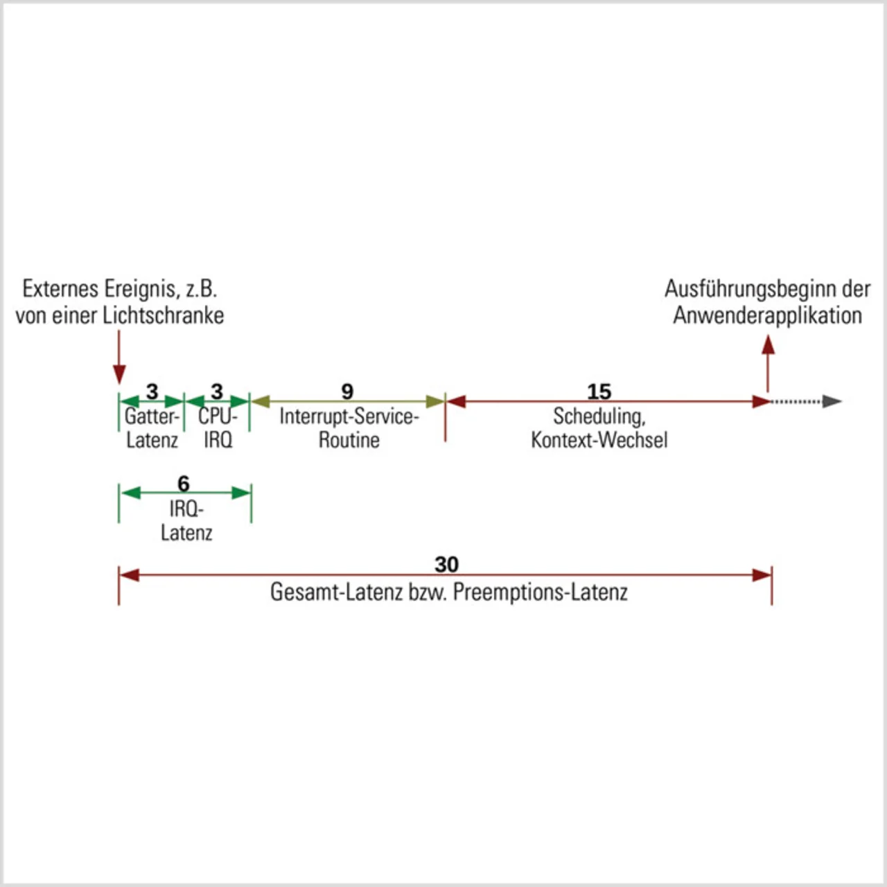 Zur Messung möglicher, irgendwo im System auftretender Latenzen speist man ein Eingangssignal für einen dafür geeigneten Controller ein, installiert ein Anwenderprogramm, das auf das Eintreffen dieses Signals wartet, und misst das Zeitintervall zwischen der Einspeisung des Signals und dem Beginn der Ausführung des Anwenderprogramms. Geeignete Eingangscontroller sind beispielsweise universelle digitale Input-Controller (GPIO), ersatzweise lässt sich aber auch die Eingangs-Handshake-Leitung eines seriellen Controllers nutzen. Der Ausführungsbeginn des Anwenderprogramms sollte vorzugsweise nicht mit Hilfe eines interruptgesteuerten Ausgabegerätes markiert werden, da hierdurch eine zusätzliche Verzögerung entsteht. Am besten sind universelle Output-Controller geeignet, deren Ausgangssignal sich unmittelbar durch einen Schreibvorgang in ein Controller-Register setzen lässt.